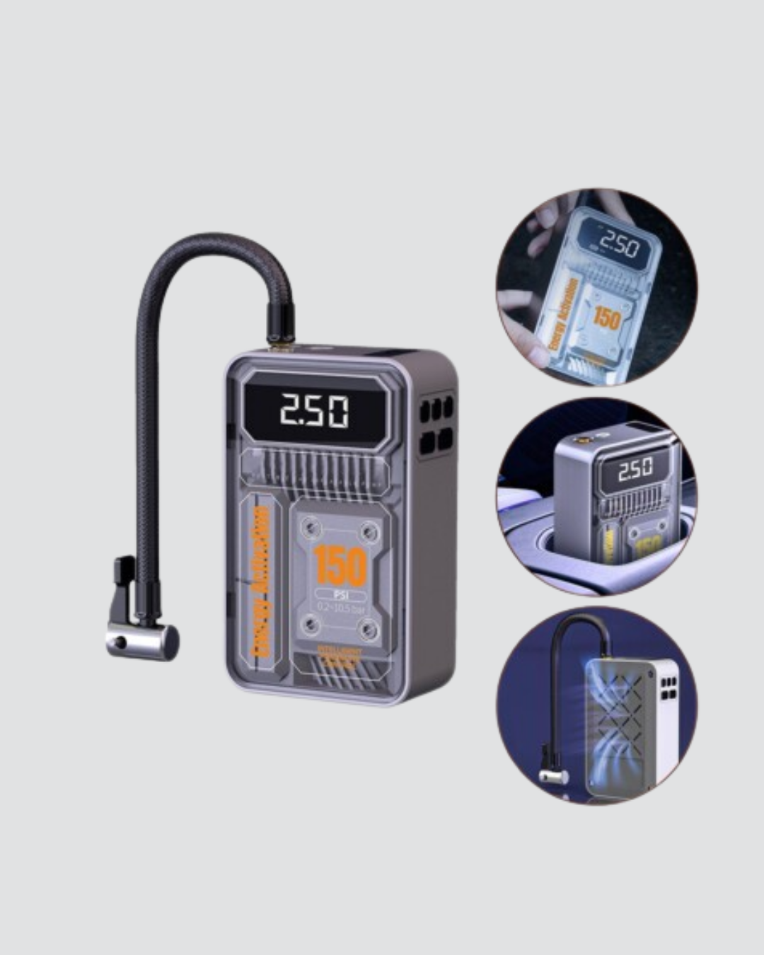 Yüksek performanslı bu kablosuz hava pompası, 150 PSI basınç gücüyle lastikler, toplar ve bisikletler için ideal bir şişirme aracıdır. 60W motor gücü ve 30000 RPM hızıyla hızlı şişirme sağlar.Kompakt boyutları sayesinde kolayca taşınabilir. Torpido gözüne, sırt çantasına veya araç bölmesine sığar. 6000mAh bataryasıyla tam dolu şarjda 4 lastiğe kadar kullanım imkanı sunar.LED ekranı sayesinde mevcut basıncı net bir şekilde görebilir, istenen değeri ayarlayabilir ve cihaz fazla basınca ulaştığında otomatik kapanma özelliğiyle güvenli kullanım sağlar.Kablo gerektirmeyen yapısı sayesinde hareket halindeyken dahi kolay kullanım sunar. Acil durumlarda hayat kurtaran bu kompakt pompa, özellikle uzun yol sürücüleri ve sporcular için vazgeçilmezdir.