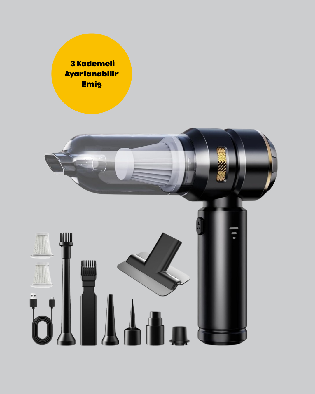 Araç içi ve küçük alan temizliklerinde profesyonel sonuçlar isteyenler için tasarlanmış bu şarjlı süpürge, güçlü performansı ve çok yönlü özellikleriyle öne çıkıyor. Kablosuz kullanım kolaylığı sayesinde priz derdi olmadan her yerde kullanılabilir. Maksimum 15.000 PA emiş gücü, en inatçı kirleri bile anında temizler. Üç kademeli emiş modu, temizlik ihtiyaçlarınıza göre özelleştirilebilir. Düşük mod hafif tozlar için, orta mod günlük kullanım için, yüksek mod ise derinlemesine temizlik için idealdir. Ayrıca üfleme modu sayesinde sadece süpürmekle kalmaz, tozları ve partikülleri üfleyerek de temizleme olanağı sunar. HEPA filtre sistemi, tozları etkili bir şekilde hapsederek daha temiz bir hava sağlar. Yıkanabilir filtre özelliği ise hijyenik kullanımın yanı sıra uzun ömürlü performans sunar. Kompakt ve hafif yapısıyla kolayca taşınabilir, ergonomik tutma kolu ise uzun süreli kullanımda konfor sağlar. Düşük gürültü seviyesiyle sessiz çalışan bu süpürge, her ortamda rahatlıkla kullanılabilir. Farklı başlık seçenekleriyle dar alanlardan hassas yüzeylere kadar her yüzeyde etkili sonuç verir. Araç içi detaylı temizlik için ideal olan bu ürün, evinizde küçük alanlarda da pratik bir temizlik imkânı sunar.