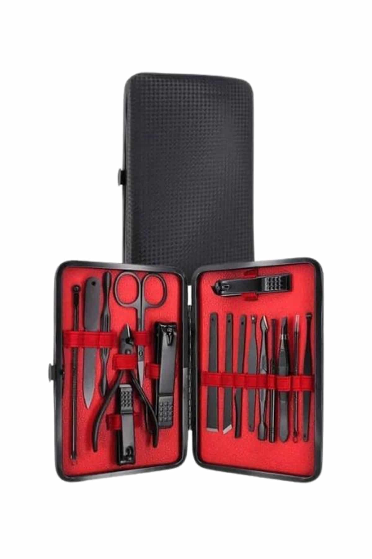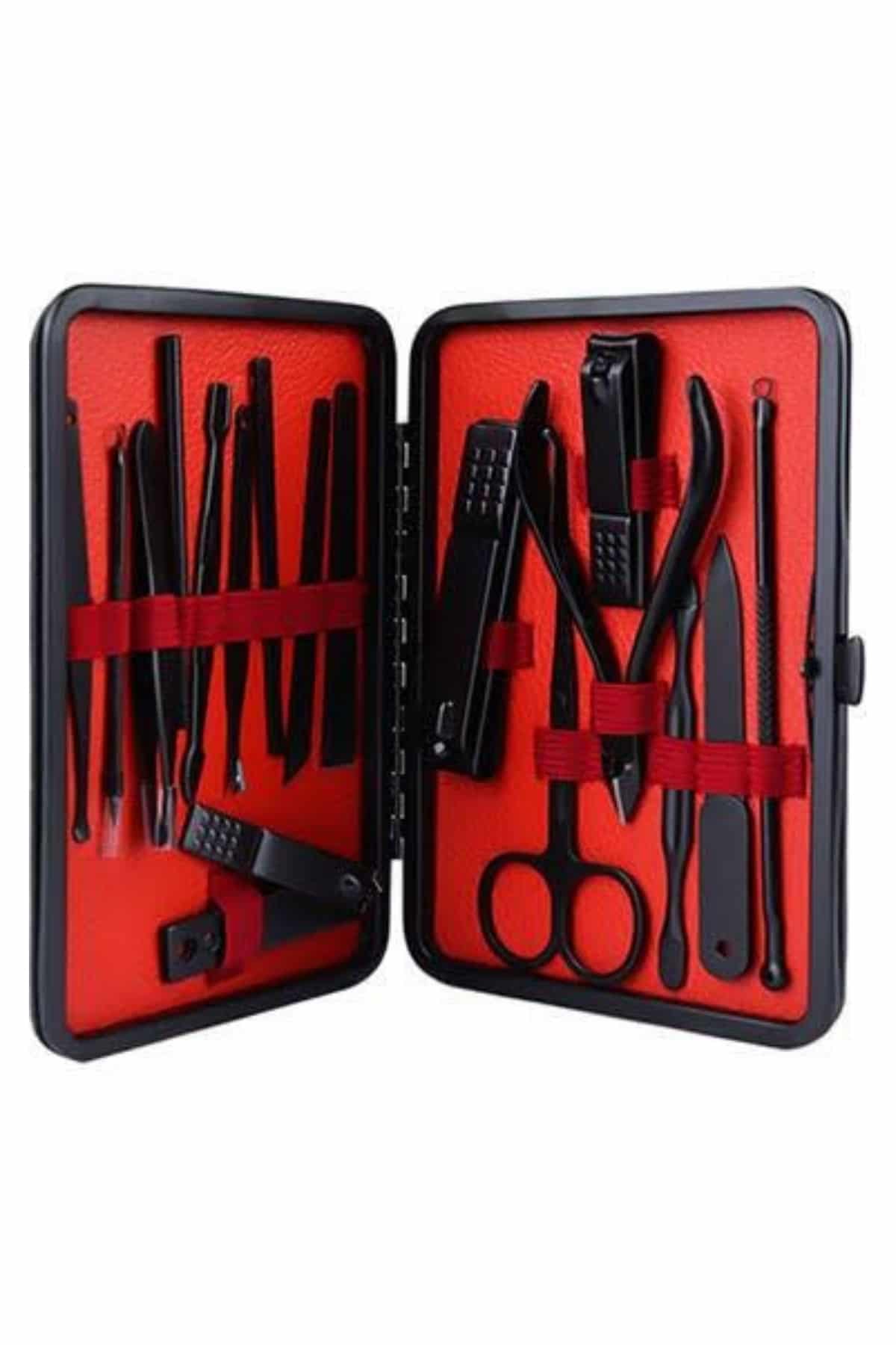 17 parça manikür pedikür seti, hem el hem de ayak bakımı için ihtiyaç duyacağınız tüm malzemeleri içerir. Paslanmaz çelikten üretilmiş olan set, dayanıklılık ve uzun ömür sağlar, ayrıca güvenli sterilizasyon olanağı sunar. Yeni nesil siyah kaymaz parlatma teknolojisi ile keskinlik artırılmış olup, estetik ve kullanım kolaylığı sağlar.Paslanmaz Çelik ve Yüksek Kalite:Tüm ürün parçaları, %100 paslanmaz çelikten üretilmiştir. Bu malzeme, sağlamlık ve dayanıklılık sağlar, korozyona karşı direnç gösterir ve enfeksiyon riskini minimize eder. Keskin ve düzgün kesimler yaparak, tırnak bakımını profesyonel seviyeye taşır.Şık ve Taşınabilir Deri Çanta:Set, şık bir deri kaplama çanta ile birlikte gelir. Fermuarla kolayca açılıp kapanabilen bu çanta, tüm aletleri düzenli tutar ve taşımasını kolaylaştırır. Hafifliği sayesinde, seti her gün çantanızda taşıyabilir veya seyahatlerde yanınıza alabilirsiniz.Kapsamlı Bakım Seti:Bu set, el ve ayak bakımının her aşamasını kolaylaştıran birçok araca sahiptir. İçeriğinde büyük ve küçük tırnak makasları, sivri uçlu tırnak makası, çift uçlu komedon, törpü, et ittirici, pedikür bıçakları ve daha birçok kullanışlı alet bulunur. Bu araçlarla tırnak bakımınızı profesyonel seviyeye çıkarabilirsiniz.Sağlık ve Temizlik:Ürünler, kolayca temizlenebilir ve sterilize edilebilir özelliklere sahiptir. Bu da hijyen açısından büyük önem taşır, çünkü enfeksiyon riskini en aza indirir. Paslanmaz çelik yapısı, uzun süreli kullanımda bile dayanıklılığını korur.Paket İçeriği: 1 adet büyük tırnak makası 1 adet küçük tırnak makası 1 adet sivri uç tırnak makası 1 adet çift uçlu komedon 1 adet törpü 1 adet et ittirici 1 adet çift taraflı tırnak kaldırma aleti 1 adet makas 1 adet pedikür bıçağı 1 adet çarpraz pedikür bıçağı 1 adet kavisli pedikür bıçağı 1 adet V şeklinde et itme 1 adet itme çubuğu 1 adet tırnak temizleme 1 adet cımbız 1 adet iğneli komedon 1 adet kulak temizlemeÖzellikler: Yüksek kaliteli paslanmaz çelik malzeme Şık ve taşıması kolay deri çanta Kolay sterilizasyon ve temizlik Tırnak bakımında profesyonel sonuçlar Seyahat dostu, taşınabilir yapı