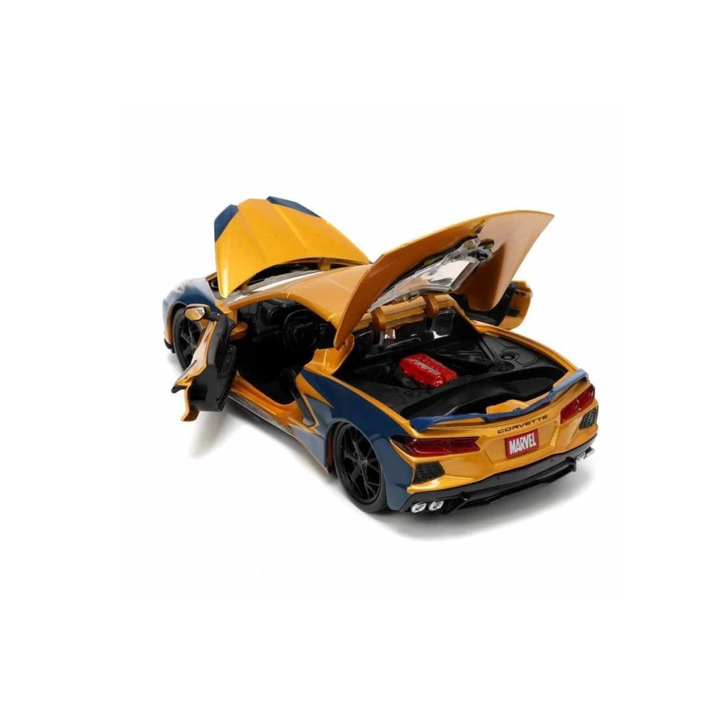 Chevy Corvette, Döküm, Serbest tekerlek,Açılan kapılar, kaporta, gövde, Döküm Wolverine figürü, 1:24, Araç Uzunluğu: 22 cm