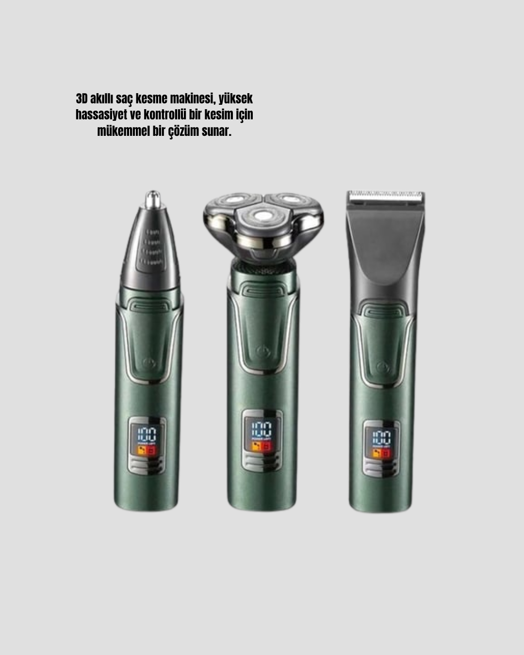 Kişisel bakımda profesyonel çözümler! Bu 3’ü 1 arada bakım seti, yüksek hassasiyetli 3D akıllı kesim sistemiyle mükemmel sonuçlar elde etmenizi sağlar. Paslanmaz çelik bıçakları sayesinde keskin, dayanıklı ve cilt dostu bir performans sunar.Saç, sakal, burun ve kulak tüylerini zahmetsizce alabilir, detaylı şekillendirme yapabilirsiniz. 100–240V aralığında çalışma özelliğiyle dünya genelinde güvenle kullanılabilir. Kablosuz ve şarjlı yapısı ile hareket özgürlüğü sunarken, ergonomik tasarımıyla kolay kavrama sağlar.