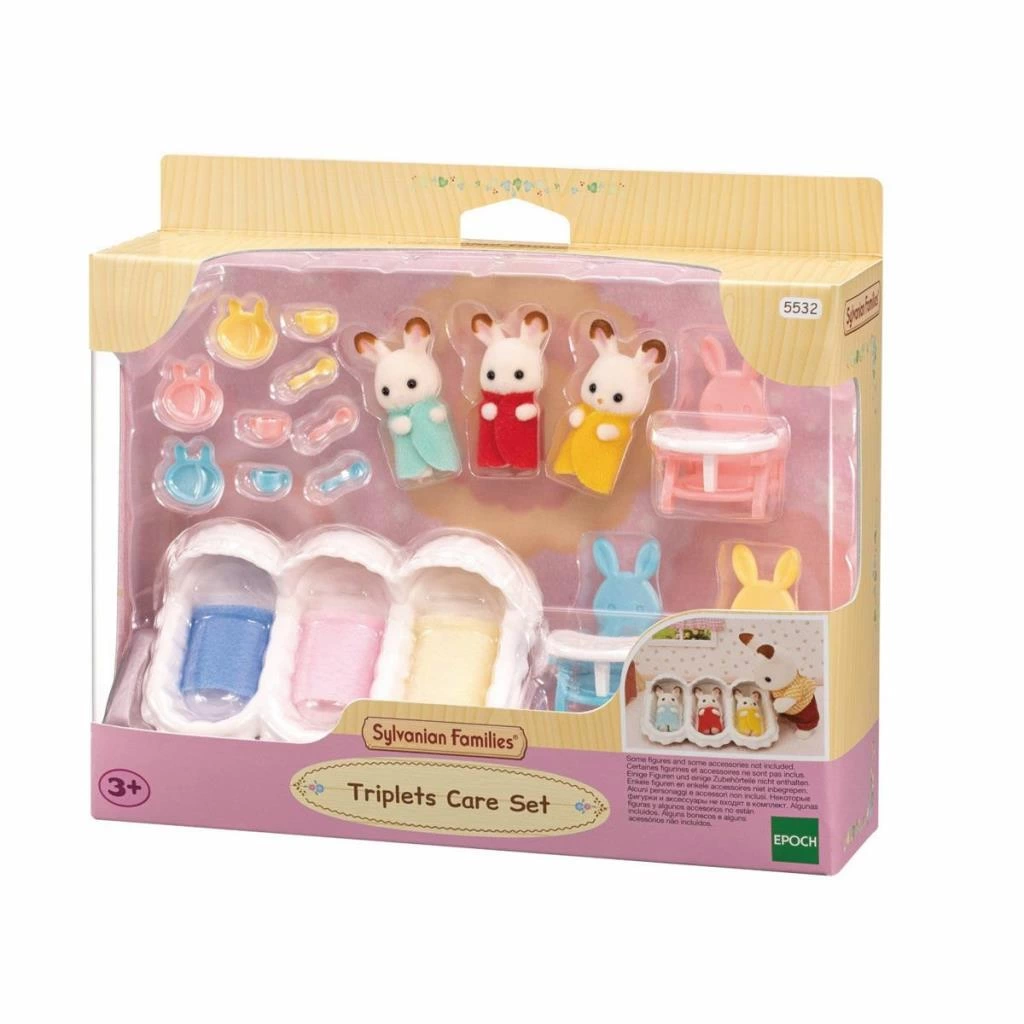 Üçüzler Bakım seti Çikolata Kulaklı Tavşan Üçüzler, battaniyeleri, beşikleri, mavi, pembe ve sarı mama sandalyeleri, tabakları, kaşıkları ile kupalarından oluşmaktadır.