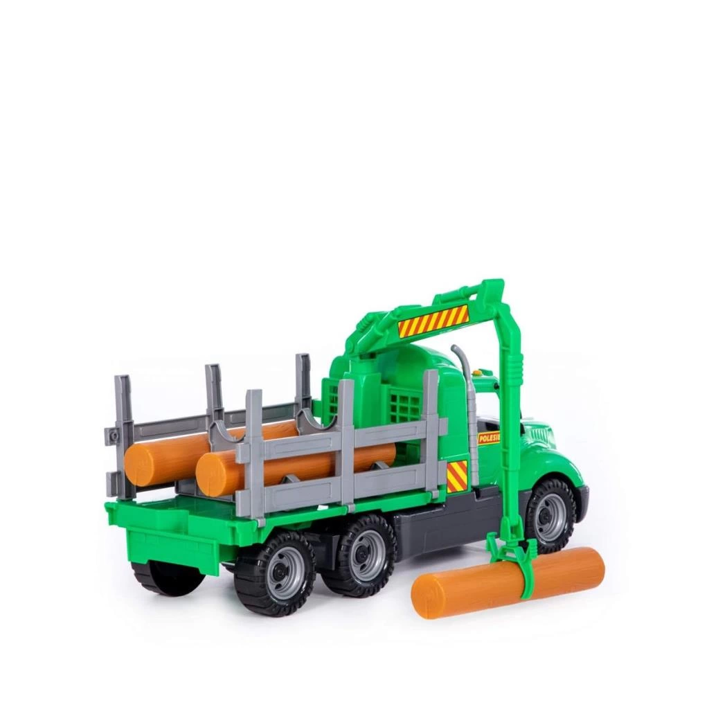Araç üzerine, kütüklerin araçtan araca taşınmasını sağlayan kıskaçlı özel bir mobil vinç yerleştirilmiştir.
