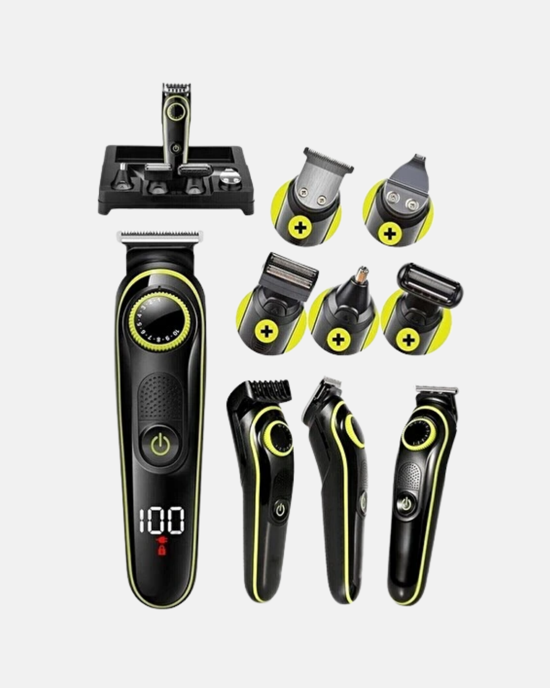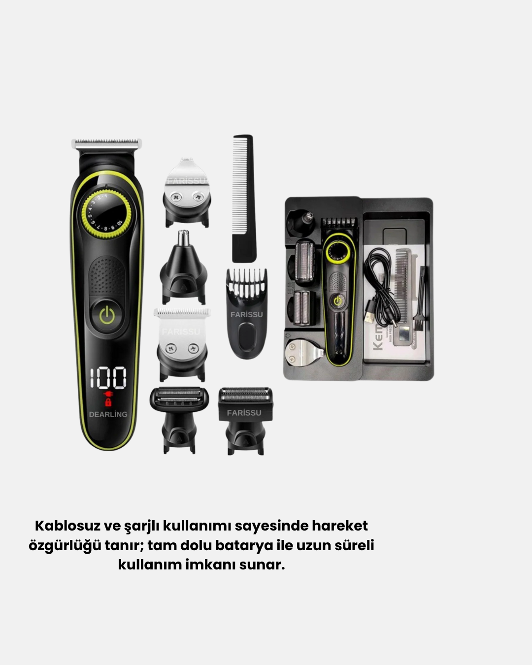 Kişisel bakım artık çok daha kolay ve profesyonel!5’i 1 Arada Erkek Bakım Seti, saç kesimi, sakal tıraşı, burun ve kulak kılı temizliği, detaylı şekillendirme ve vücut tıraşı gibi tüm işlemleri tek cihazda bir araya getirir.Güçlü motoru ve paslanmaz çelik bıçakları, cilt dostu bir şekilde keskin ve pürüzsüz sonuçlar elde etmenizi sağlar.Kablosuz ve şarjlı kullanım özelliği, hareket özgürlüğü tanıyarak her ortamda bakım yapmanıza imkan verir.Tam dolu bataryasıyla uzun süre kesintisiz performans sunar.Ayrıca ayarlanabilir tarak başlıkları, kişisel stilinize uygun farklı kesim uzunlukları oluşturmanıza olanak tanır.Ergonomik tutuşa sahip şık ve modern tasarımı, banyo alanınıza estetik bir dokunuş kazandırırken, LED ekranı sayesinde pil seviyesini kolayca takip edebilirsiniz.Suya dayanıklı başlıkları kolayca çıkarılıp yıkanabilir, böylece hijyenik bir kullanım sağlanır.Düşük ses seviyesiyle konforlu bir deneyim sunan bu set, günlük bakımınızı profesyonel bir rutine dönüştürür.