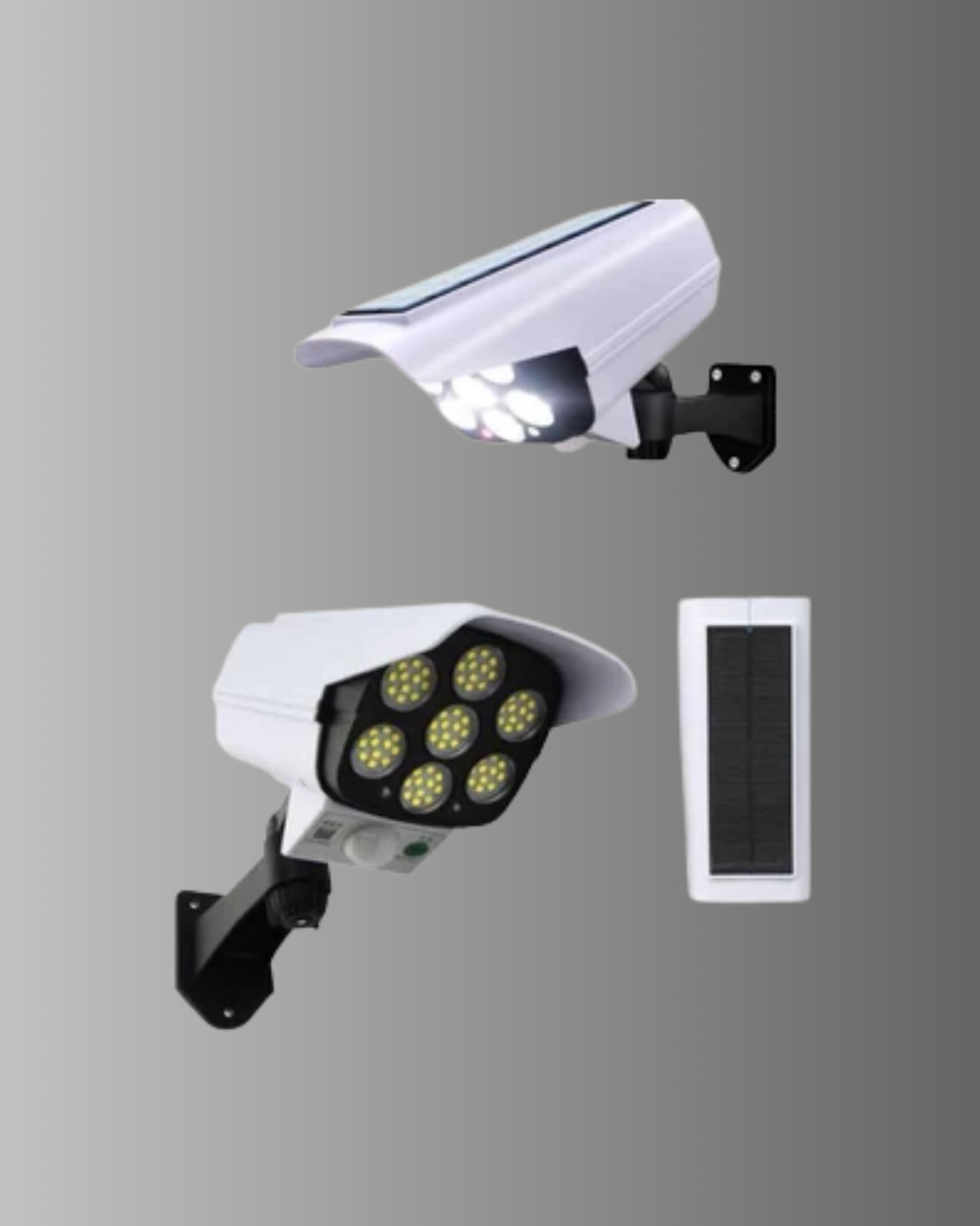 Bu 2’si 1 arada güneş enerjili dış mekân güvenlik lambası, hem güçlü bir aydınlatma kaynağı hem de gerçekçi görünümlü kukla güvenlik kamerası olarak işlev görür. 77 adet yüksek parlaklıkta LED ile donatılan bu ürün, geceleri davetsiz misafirleri caydırmak için ideal bir çözümdür. kamera şekli üzerindeki kırmızı yanıp sönen ışık, gerçek bir kamera izlenimi vererek ekstra güvenlik sağlar.Dahili 2400mAh kapasiteli (2 x 1200mAh 18650) pil, güneş paneli (5.5V / 300mA) aracılığıyla gün boyu şarj olur ve 8–10 saate kadar sürekli aydınlatma sağlar. 3 farklı mod ile kullanıcıya esnek kullanım imkânı sunar: Karanlıkta yalnızca kırmızı ışık yanar, hareket algılandığında güçlü ışık devreye girer. Zayıf ışık açık kalır, hareket algılandığında parlak ışığa geçer. Her zaman açık mod, kırmızı ışık da yanıp söner.PIR hareket sensörü 120° açıyla, 5–8 metre mesafede algılama yapar. Ürün IP65 su geçirmezlik sertifikasına sahiptir ve dış mekân kullanımı için uygundur. Malzeme kalitesi PVC + PC olup dayanıklıdır. Toplam ürün ağırlığı 431 gramdır.