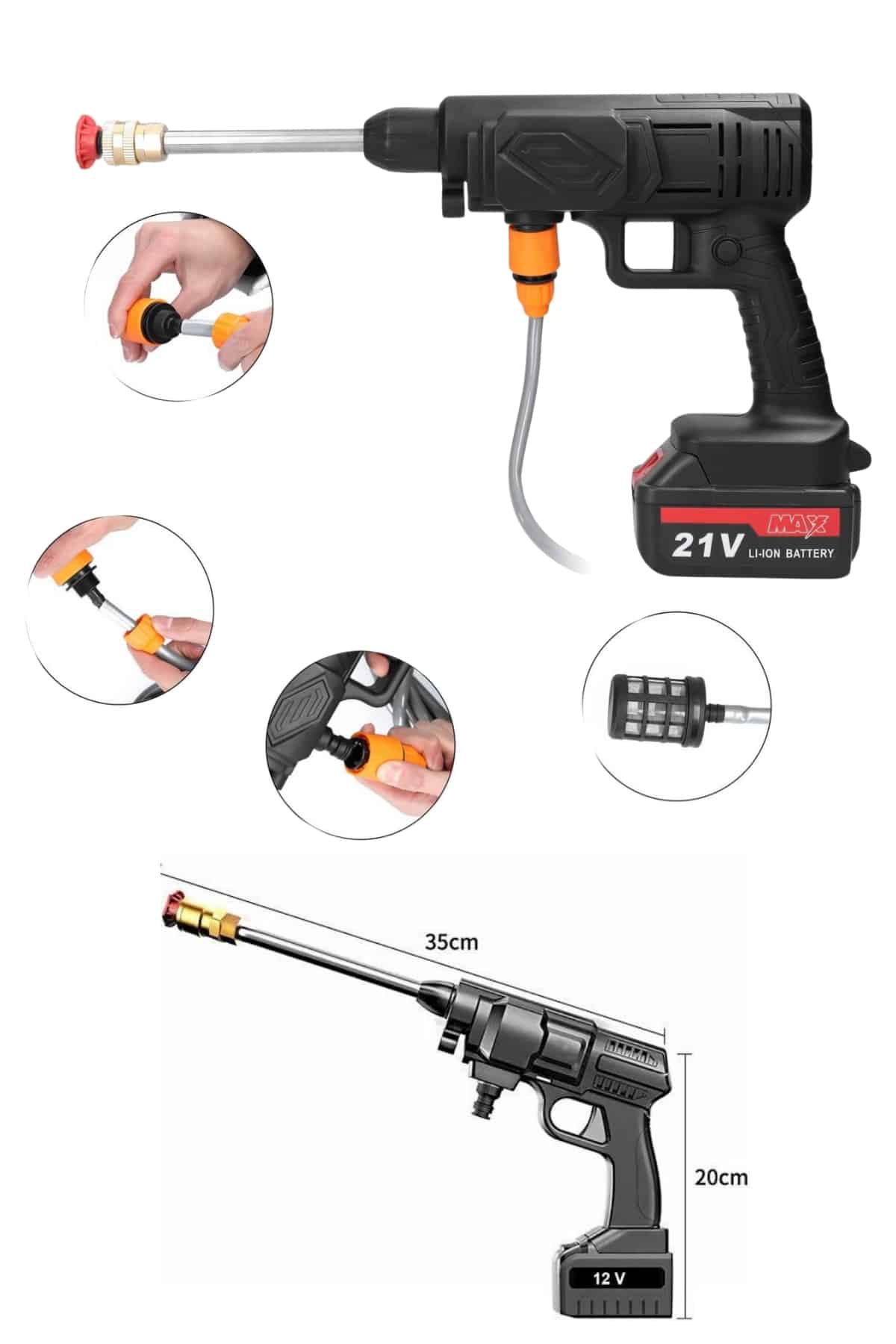 Taşınabilir Akülü Yıkama Makinesi – Güçlü Temizlik, Kolay KullanımGüçlü performansı ve taşınabilirliğiyle dikkat çeken Akülü Yıkama Makinesi, evde ve dış mekanlarda temizlik ihtiyaçlarınızı hızlı ve verimli bir şekilde karşılamak için ideal bir çözümdür. 21V XR Li-Ion bataryası, kömürsüz motoru ve uzun süreli çalışma kapasitesi ile mükemmel temizlik sonuçları sunar. Bu cihaz, araba yıkamadan bahçe temizliğine kadar çeşitli temizlik işlemlerini kolayca gerçekleştirmenizi sağlar.Etkili Temizlik ve Güçlü Performans1500mAh çift aküsü ve 5 pilli dahili bataryası ile uzun süreli kullanım sağlar. 1.7 Mpa’lık yüksek tepe basıncı, en inatçı kirleri bile rahatlıkla temizlemenize olanak tanır. 3.2 L/dak su çıkışı sayesinde, her kullanımda etkili ve hızlı temizlik sağlarsınız. Metal pompa silindiri, uzun ömürlü ve dayanıklı bir kullanım için tasarlanmıştır, böylece cihaz uzun süre performans kaybı yaşamaz.Hızlı Şarj ve Kolay Kullanım60 dakikalık hızlı şarj süresi ile her zaman kullanıma hazırdır. 2 kg’lık hafif tasarımı, taşımasını ve yönlendirilmesini son derece kolaylaştırır. Ergonomik yapısı sayesinde her yaştan kullanıcı tarafından rahatlıkla kullanılabilir. Araba yıkama, bisiklet temizliği veya evde bahçe sulama gibi farklı kullanım alanlarında da size büyük kolaylık sağlar.Dayanıklı ve Uzun Süreli KullanımÜrün, 2 yıl garanti süresiyle birlikte gelir, böylece uzun vadeli kullanımda güvenli bir deneyim sunar. Hafif yapısı, güçlü performansı ve yüksek dayanıklılığı ile her türlü temizlik işinizi zahmetsizce tamamlamanızı sağlar. Hem evde hem de dış mekanlarda kullanım için mükemmel bir tercihtir.