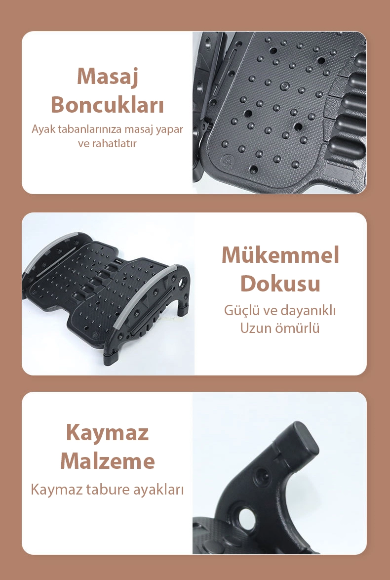 – Masa altı ayak desteği sayesinde çalışma masanızın yüksekliğini kolayca ayarlayabilirsiniz. – Ergonomik tasarımı ile uzun saatler boyunca rahat bir şekilde oturmanızı sağlar. – Ayakların daha iyi pozisyon almasını destekleyerek bel ve sırt ağrılarının azalmasına yardımcı olur. – Yapısıyla dayanıklılığı ve stabilitesiyle dikkat çeker, uzun ömürlü kullanım imkanı sunar.