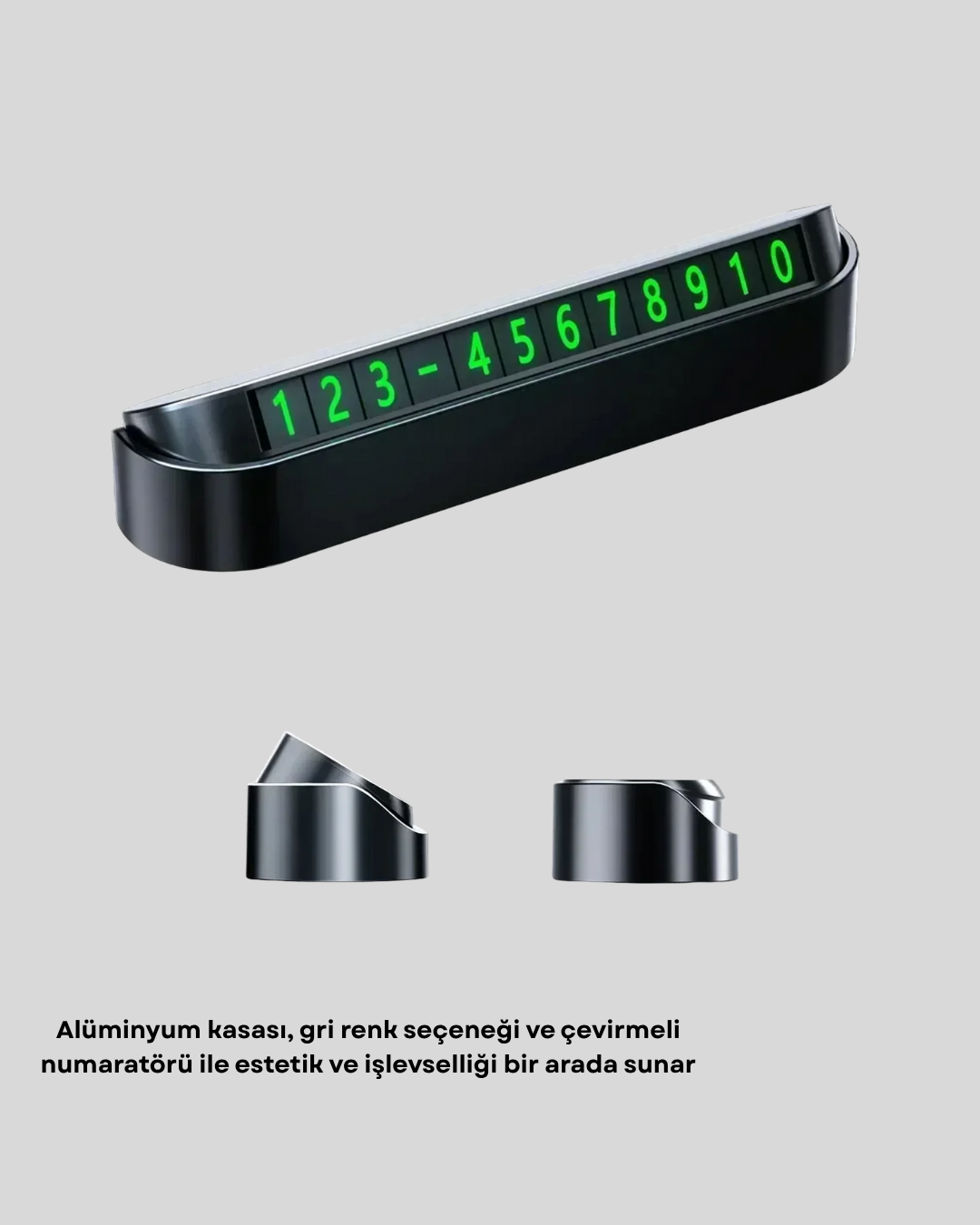 Estetik ve işlevselliği bir araya getiren Alüminyum Kasa Gri Çevirmeli Araç İçi Telefon Numaratörü, aracınıza hem modern bir görünüm kazandırır hem de park halindeyken iletişim bilgilerinizi net bir şekilde sergiler. Şık gri rengi ve alüminyum kasasıyla uzun ömürlü kullanım sunan bu ürün, zarif detaylarıyla aracınızın iç tasarımına uyum sağlar.Yüksek kaliteli alüminyum malzeme, paslanmaya ve aşınmaya karşı dayanıklıdır. Bu sayede uzun yıllar boyunca ilk günkü parlaklığını korur. Çevirmeli numaratör sistemi, telefon numaranızı pratik bir şekilde ayarlamanıza olanak tanır. Büyük ve net rakamlar, uzaktan dahi kolayca görülebilir.Ürün, çift taraflı güçlü bant ile aracın ön camına veya uygun düz bir yüzeye kolayca monte edilir. Hareket halindeyken yerinden oynamaz, güvenli bir şekilde sabit durur. Gece görüşüne uygun net yazı karakterleri sayesinde düşük ışıkta bile numaranız görünür kalır.Zarif gri tonlu metalik yüzeyi ve minimalist tasarımıyla hem konfor hem şıklık sunan bu oto numaratör, aracına değer veren her sürücünün vazgeçilmez aksesuarı olacak.