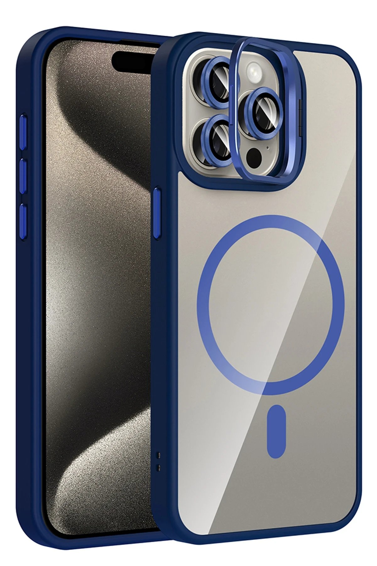 Apple iPhone 15 Pro Max Remim Lensli Magsafe Standlı Kapak – Lacivert-(5796)