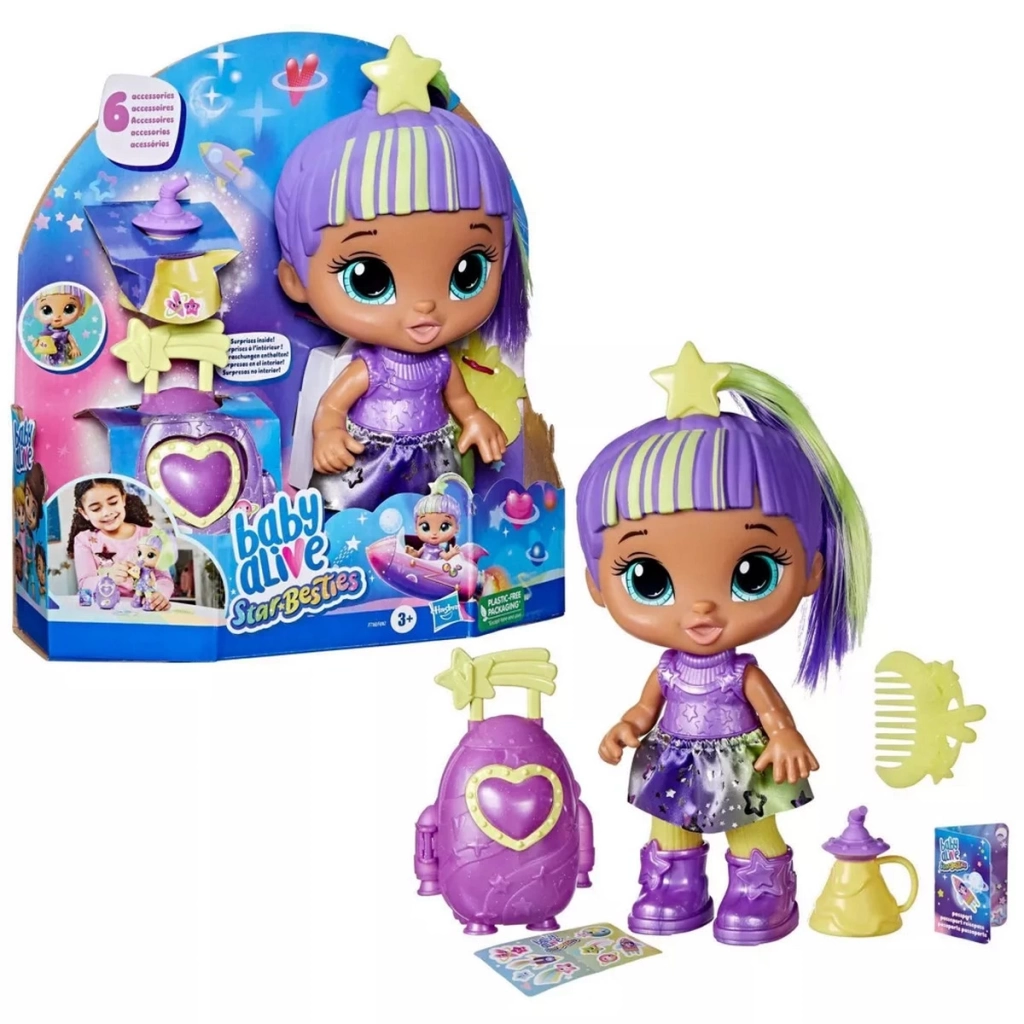Galaksiden ilham alan cesur tarzı ve aksesuarlarıyla bu Baby Alive Star Besties bebeği,