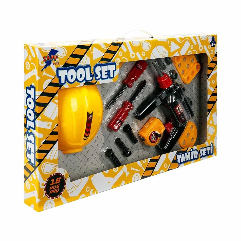 16 parçadan oluşan set içerisinde; kask, matkap, vida, tornavida gibi çeşitli tamir araç-gereçleri yer almaktadır.