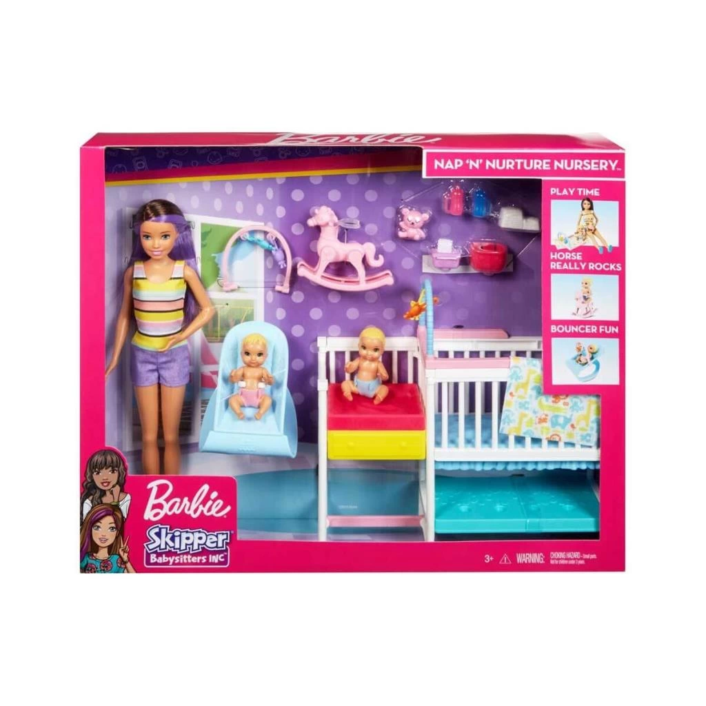 Set içerisinde; Moda kıyafetler ve aksesuarlara sahip Skipper bakıcı bebek, bebek bezli iki bebek oyuncak, alt değiştirme tezgahlı