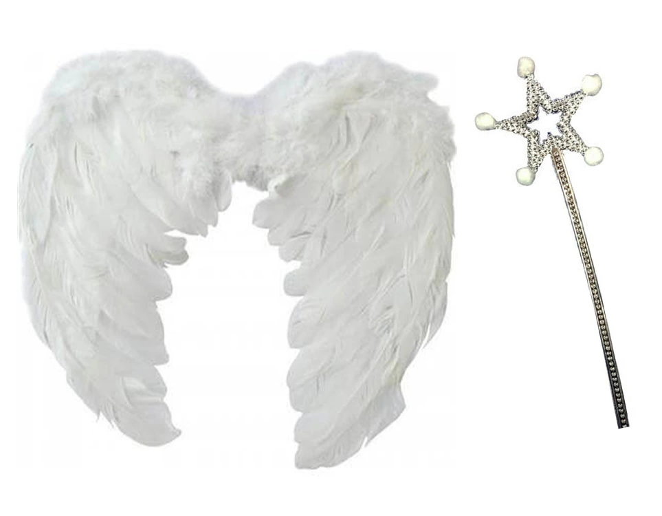 Beyaz Renk Orta Boy Çocuk Melek Kanadı 35×50 cm ve Beyaz Ponponlu Asa
