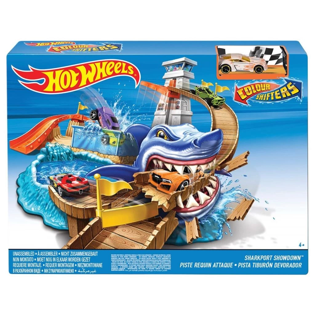 Heyecanlı dolu, aksiyon yüklü, bol renkli bu macera pistinde, çocuğunuz araba yiyen dev köpek balığından kaçmaya çalışacak. Kulenin tepesinden inen rampada hızlanırken dikkatli olmak gerek. Çünkü köpek balığı metal arabaları keskin dişleri arasına hapsetmeye hazır bekliyor. Eğer köpek balığı arabayı yakalarsa, bırakma kolunu hedef alarak bir başka aracı aşağı göndermek gerekiyor. Bırakma koluna çarpınca hapsolmuş araba serbest bırakılır. Iskalayınca araba pistten çıkar ve her iki araba da köpek balığına yem olur. Sharky Seti bir adet Renk Değiştiren araba ve biri su tankı, diğeri havuz olmak üzere iki renk değiştirme bölgesi içerir.