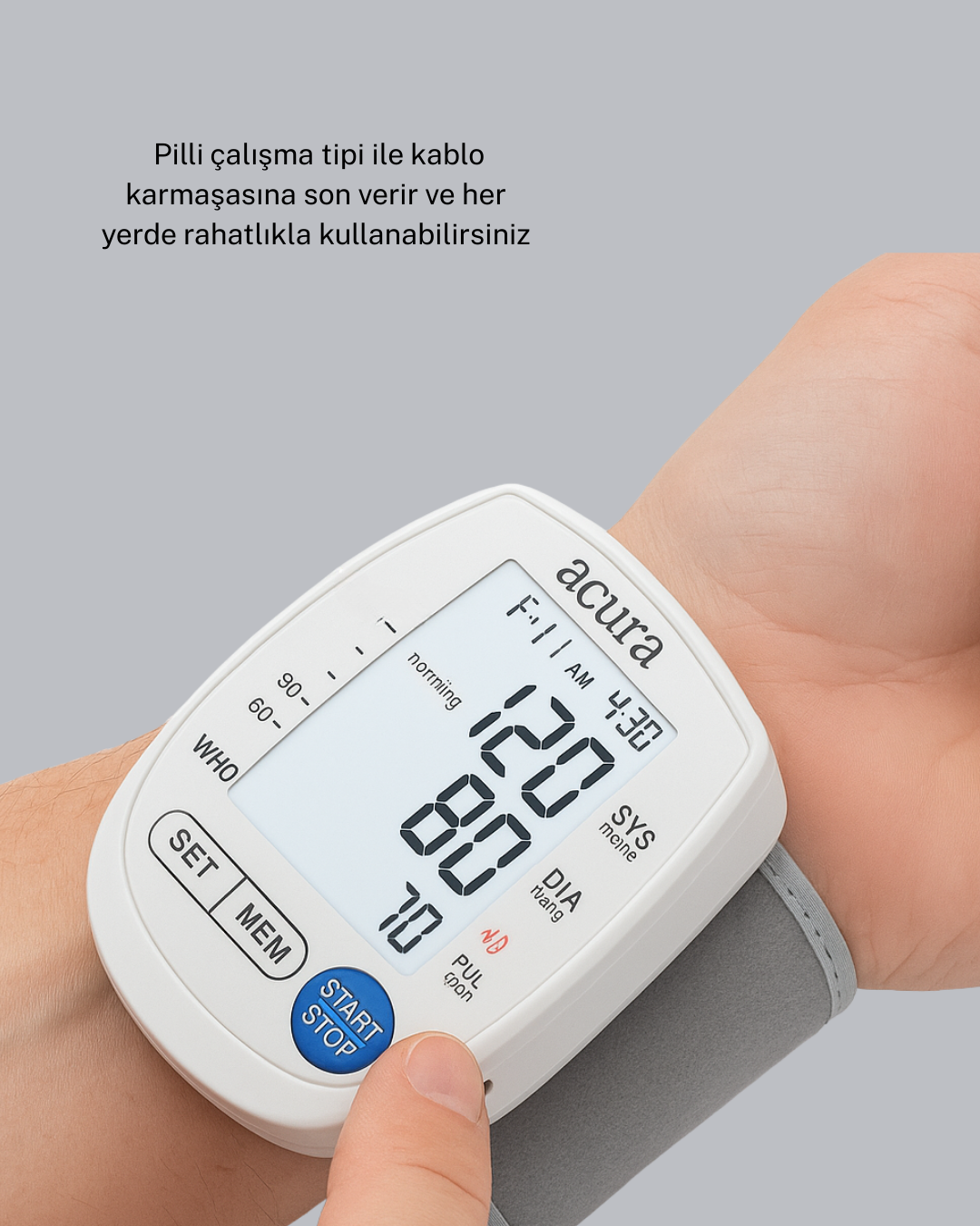 Bilekten ölçüm yapabilen bu gelişmiş dijital tansiyon aleti, hem pille hem de şarj ile çalışabilen çift güç sistemi sayesinde her ortamda kullanım kolaylığı sağlar. Dijital ekran, ölçüm sonuçlarını yüksek netlikte gösterir ve değerlerin okunmasını kolaylaştırır. Günlük tansiyon takibini hızlıca yapmanız için tek tuşla ölçüm özelliği sunar. Hafıza fonksiyonu, önceki ölçümlerinizi kayıt altında tutarak zaman içindeki tansiyon değişikliklerini takip etmenize yardımcı olur. Böylece doktor kontrollerinizde daha sağlıklı veri paylaşabilirsiniz. Yer kaplamayan kompakt yapısı, cihazı taşıma çantası ya da günlük çanta içinde kolayca saklamanıza imkân tanır. Pilli kullanım özellikle dış mekânlar için avantaj sağlarken, şarjlı kullanım uzun ömürlü tasarruf sunar. Sessiz çalışan motoru rahatsızlık vermez ve ölçüm sırasında bileği sıkmadan doğru sonuç verir. Sağlıklı yaşam için vazgeçilmez bir destek ürünüdür.