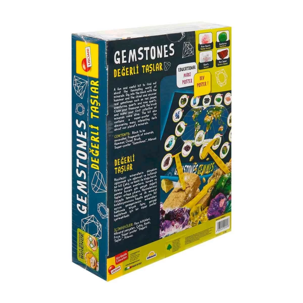 Set içerisinde; kazı kütükleri, mineral parçaları, çekiç, keski, fırça, süper poster “Değerli Taşlar” ve kılavuz bulunmaktadır.