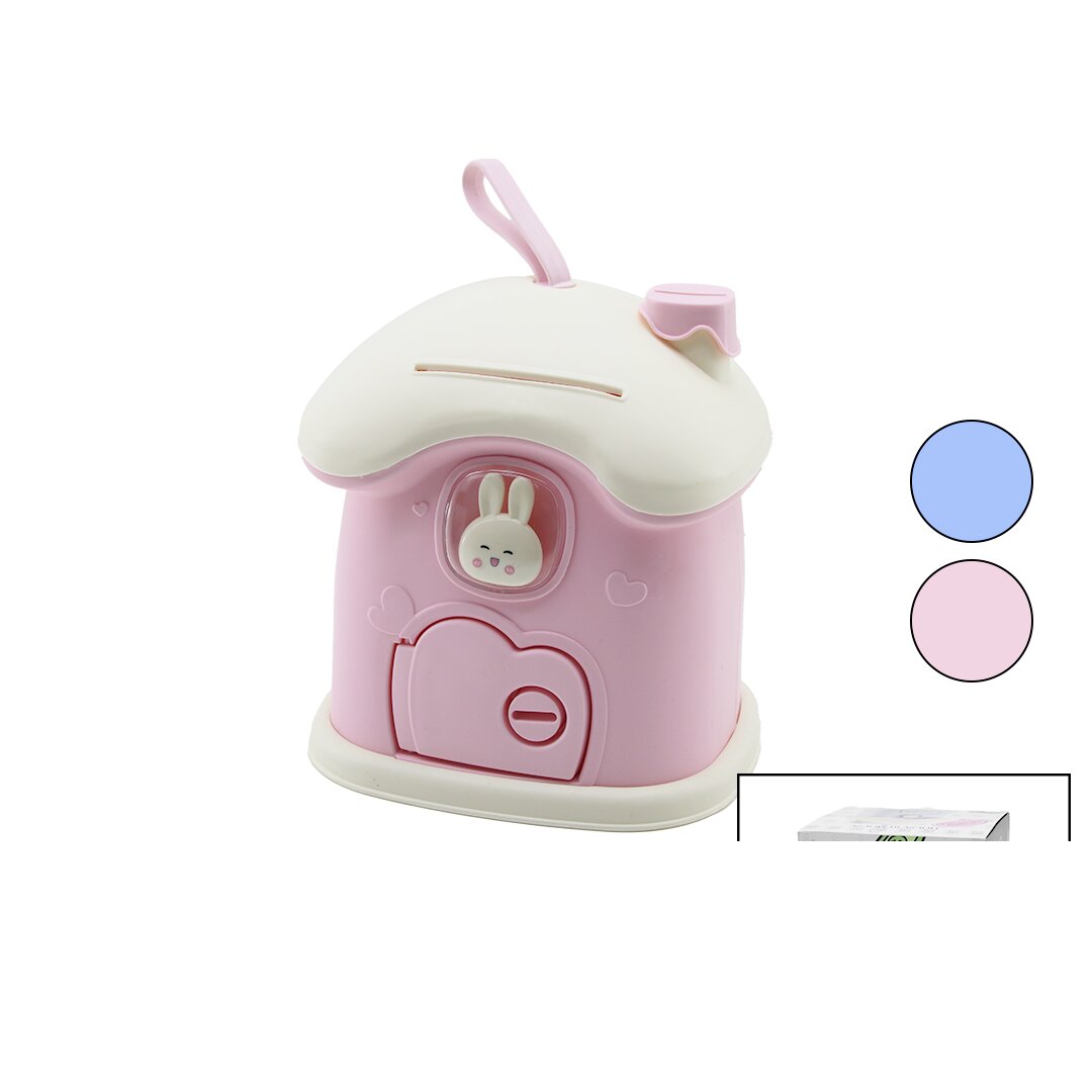 BÜYÜK=18X16X18CM EV MODELİ KİLİTLİ RENKLİ PLASTİK ÇOCUK KUMBARA TAVŞAN FİGÜRLÜ