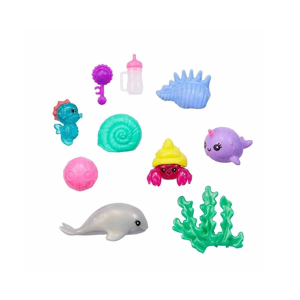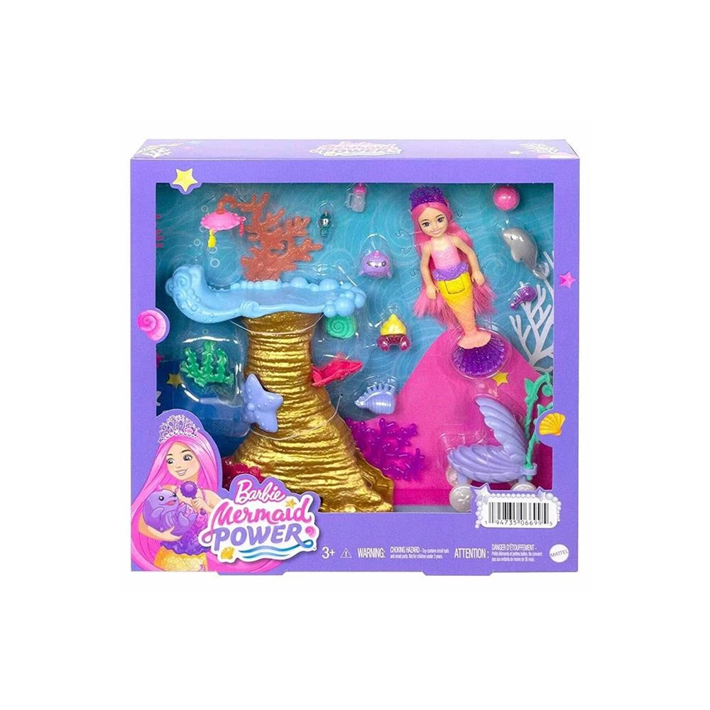 Chelsea Deniz Kızı Bebek ve oyun setiyle heyecan dolu maceralara atılın. Chelsea Deniz Kızı Bebeği’nin yavru yunus, denizatı, boynuzlu balina ve 3 farklı deniz kabuğu olan keşiş yengeciyle ilgilenmesine yardım edin. Mercan kayalıklarından ilham alan oyun setinde, saklanma yerleri ve oyun alanlarının yanı sıra sevimli bir dönence bulunan uyku alanı da vardır.