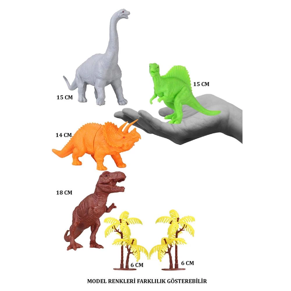Bu setin içerisinde 4 farklı dinozor figürü ve 2 adet ağaç aksesuarı bulunmaktadır. Dinozorların boyutları 14-18 cm arasında değişmektedir, bu da çocukların ellerinde rahatlıkla tutmalarını sağlar. Figürler gerçekçi detaylara sahiptir ve çocukların hayal güçlerini canlandırmalarına yardımcı olur.