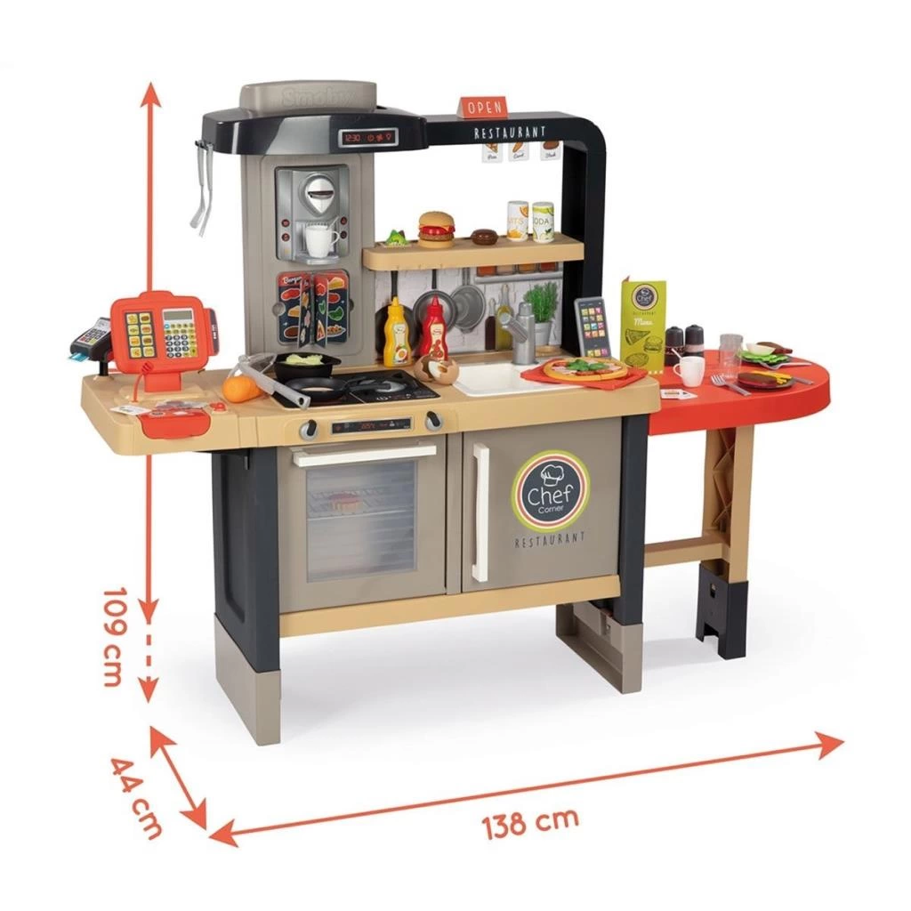 Mutfakta gerçek bir şef olmak için gereken her şey var: buzdolabı, fırın, ses efektli ocak, lavabo, gerçek su işlevli musluk, espresso makinesi ve yemek kitabı.