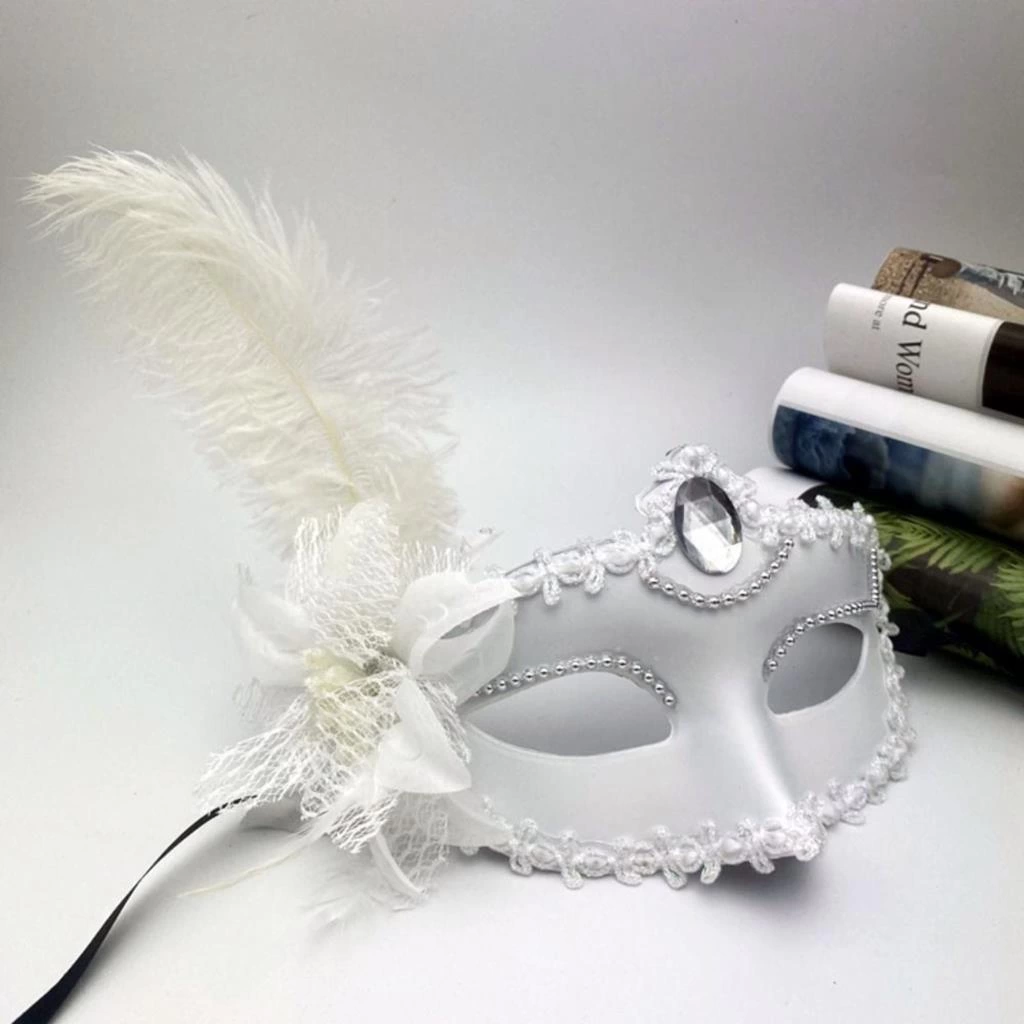 Beyaz Mat Renk Yandan Tüylü Güllü Parti Balo Venedik Maskesi 16×22