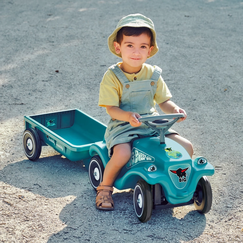 BIG Bobby Car Classic Eco 2.0 seti ve ilgili BIG Bobby Caddy Eco römorku geri dönüştürülmüş plastikten yapılmıştır ve bu nedenle özellikle çevre dostudur.