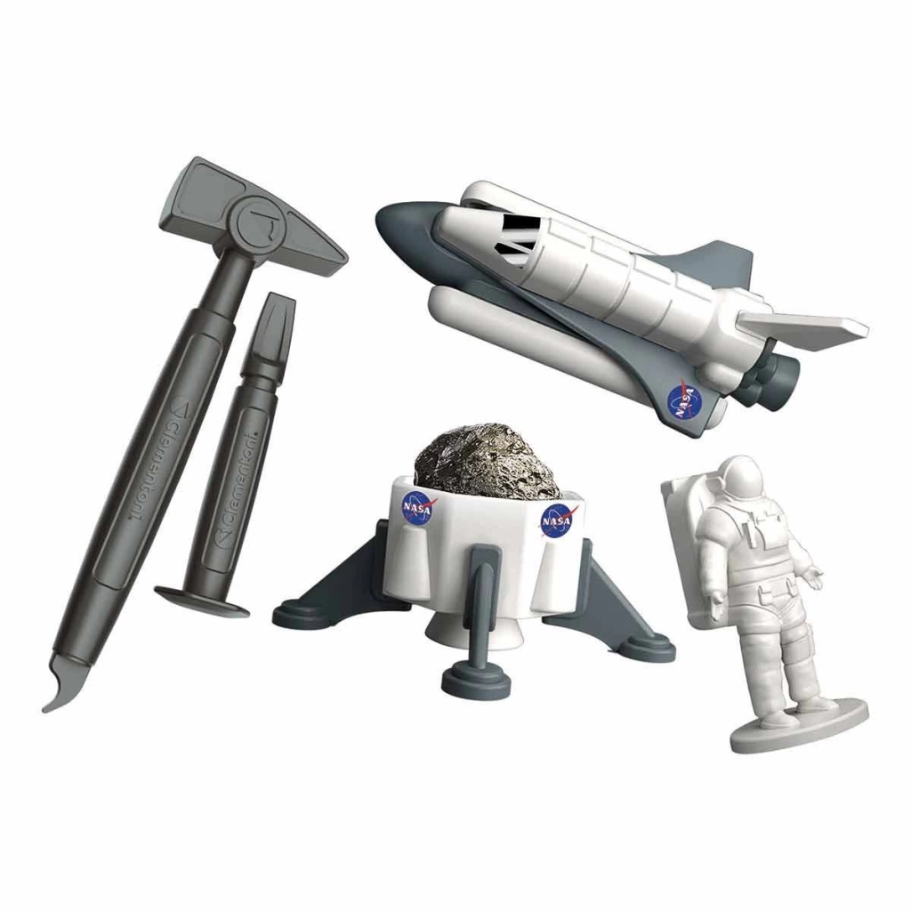 Kutu içerisinde; astroit bloğu, uzay mekiği parçaları, uzay iniş aracı parçaları, astronot, çıkartmalar, taş örneği, çekiç, keski