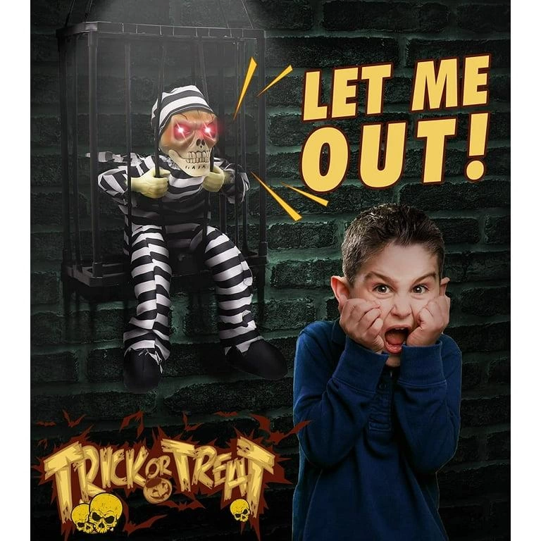 Çocuk Hareketli Sesli Sensörlü Mahkum Görünümlü Kuru Kafa İskelet Dekorasyon 22×27 cm