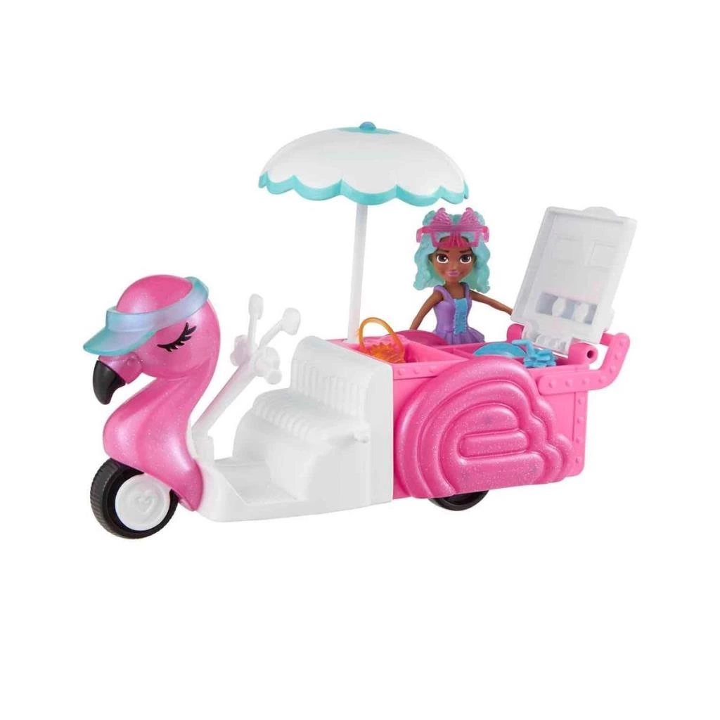 POLLY POCKET™ FLAMİNGO ATIŞTIRMALIK ARABASI™ oyun setiyle tropikal ortamda maceraların izini sürün. 1 adet 7 cm bebek, 1 adet yavru köpek figürü ve 17 aksesuar içeren bu temalı scooter, çocuklara tatlı servisi yapmayı sevdirecek. Flamingo şeklindeki tasarımı, çıkarılabilir şemsiyesi ve dönen tekerlekleriyle bu araç göze de hitap ediyor. Soğutucuyu açın ve içinden isterseniz lezzetli bir dondurma isterseniz ferahlatıcı ananas suyunu seçip alın. Çocuklar, 7 cm uzunluğundaki bebeğe kirazlı sevimli bir tişört veya çilek baskılı bir pantolon giydirebilir. Yola çıkma vakti geldiğinde vizör şapkasını ve gözlüğünü takabilir. Meyve keyfiyle dolu Polly oyun seti, özellikle tropikal lezzetleri seven 4 yaş ve üzeri çocuklar için ideal bir hediyedir. Renkler ve süslemeler çeşitlilik gösterebilir.