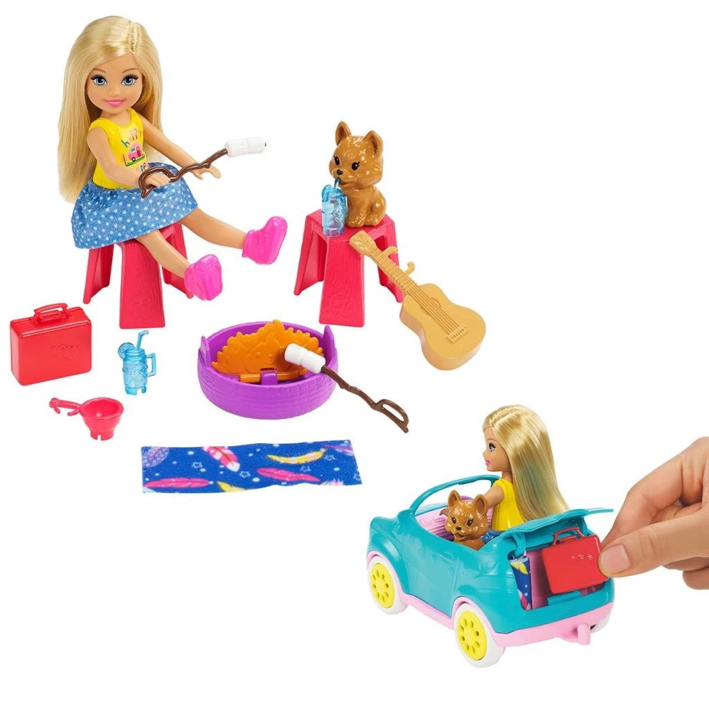 Chelsea™ bebek ve köpeği, evin arka bahçesi dahil her yerde kamp yapmaya hazır. Çünkü özel araçları Club Chelsea™ Karavan onların her zaman yanında! Karavan arabadan ayrılıp oyun setine dönüşüyor ve adeta evden uzakta yeni bir ev yaratıyor. Seyahat etmek için karavanı üstü açılır arabaya bağla, kamp vakti geldiğinde karavanı ayır. Daha sonra karavanı açarak lavabolu mutfağı, ocağı, açılan kapılı buzdolabını, merdivenli ranzayı ortaya çıkar. Bu ranza sayesinde arkadaşın geldiğinde kalacak yeri olacak. Köpeğin girip çıkabilmesi için ufak bir köpek kapısı bile var. 10’u aşkın oyuncakla hayal gücünü canlandırıp kamp şarkıları söyle ve hikayeler anlat. Klasik kamp anlarını yaşayabilmen için kamp ateşi, gitar, iki tabure ve marşmelovlu iki çubuk ve bunların yanında iki içecek, bir tencere, bir havlu ve bir bavul bulunuyor. Yola çıkma vakti geldiğinde her şeyi topla. Arabanın bagajı da dahil, yola çıkarken eşyalarını koyabileceğin birçok yer var. Chelsea oyuncak bebek, üzerinde “happy camper” (mutlu kampçı) yazan sarı tişörtü, beyaz benekli kumaştan mavi eteği ve pembe ayakkabılarıyla dünyayı keşfetmeye hazır. Yavru köpeğinin de suratında mutluluktan uçtuğunu gösteren sevimli bir ifade var. Çocuklar bu oyun setiyle dünyayı keşfetmeye bayılacak. Eğlenceli birçok farklı oyun için diğer Club Chelsea™ bebek ve aksesuarlarını topla (her biri ayrı olarak satılır ve stoklar sınırlıdır). Etek ve ayakkabı giyen Chelsea™ bebek, yavru köpek, araba, karavan, gitar, kamp ateşi, iki tabure, marşmelovlu iki çubuk, iki içecek, bir tencere, bir havlu, bir battaniye ve bir bavul dahildir. Renkler ve süslemeler çeşitlilik gösterebilir.