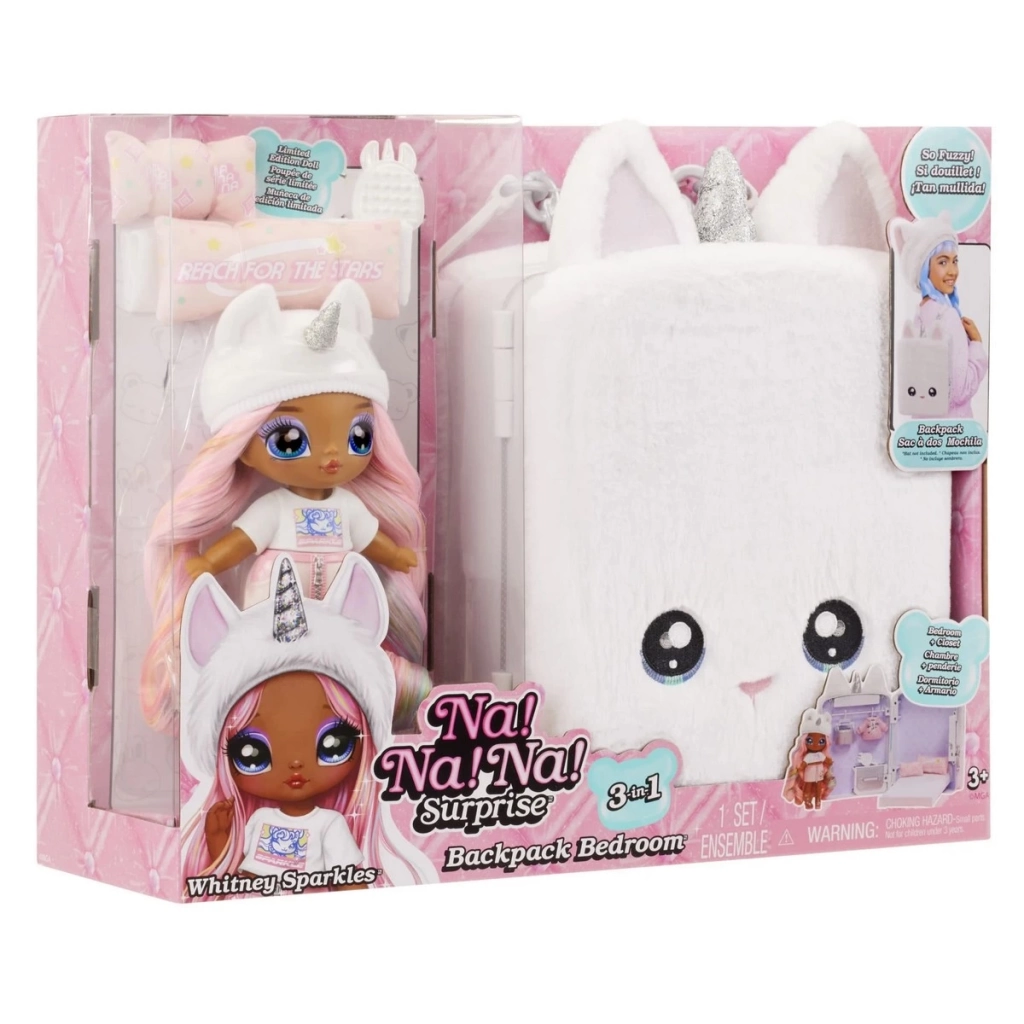 İçindekiler: 1 yatak odasına dönüşen sırt çantalı oyun seti, 1 Na! Na! Na! Surprise bebeği, kıyafetler, 2 askı, 2 yastık ve 1 saç fırçası.