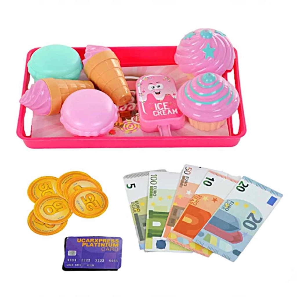 Set içerisinde yer alan kağıt paralar, bozuk paralar, kredi kartları ve yiyecek figürleri ile oyun keyfi ikiye katlanıyor!