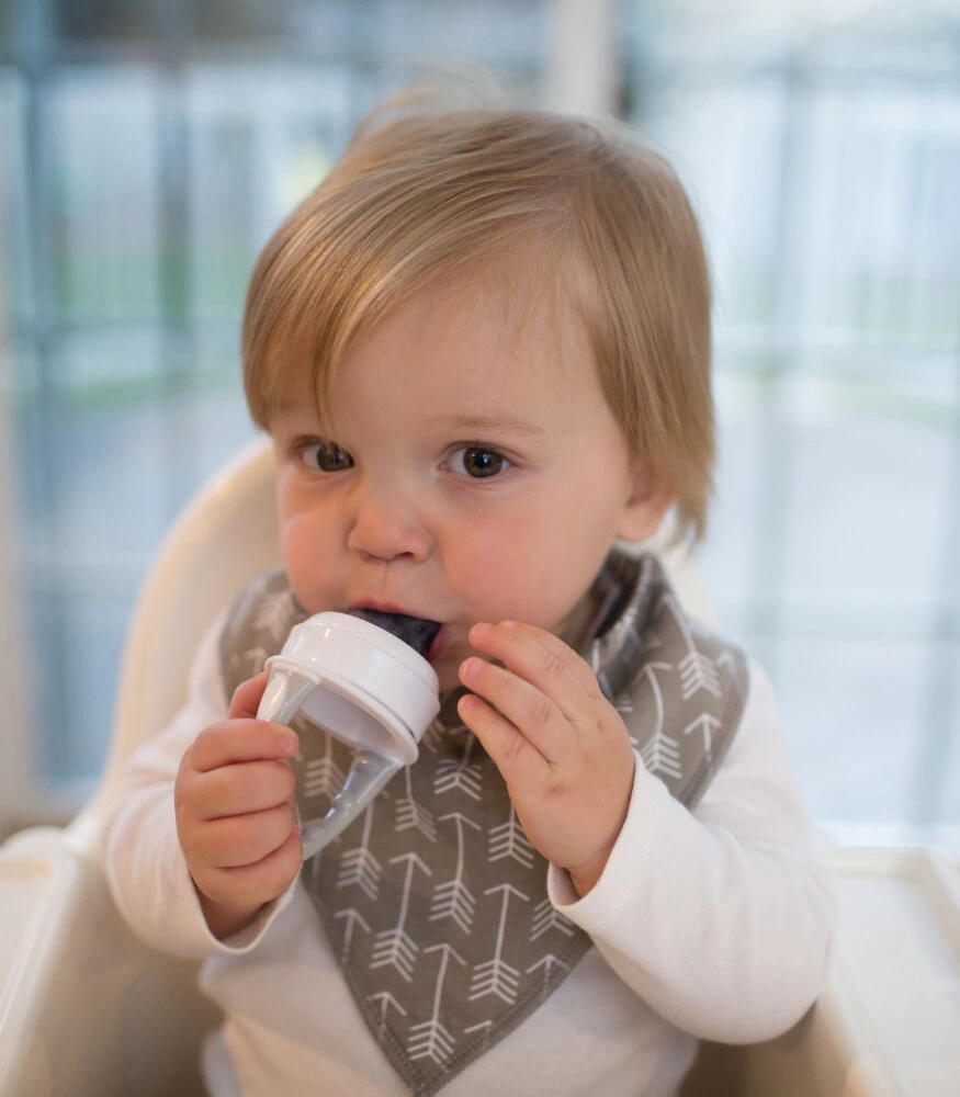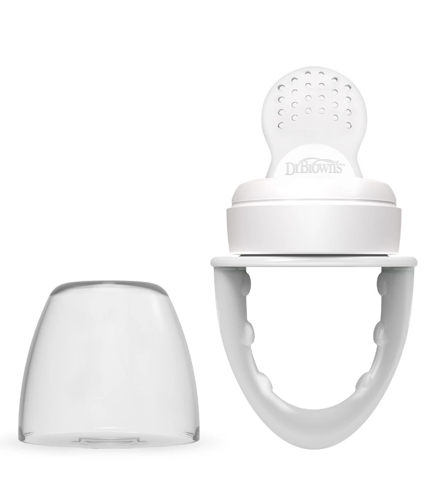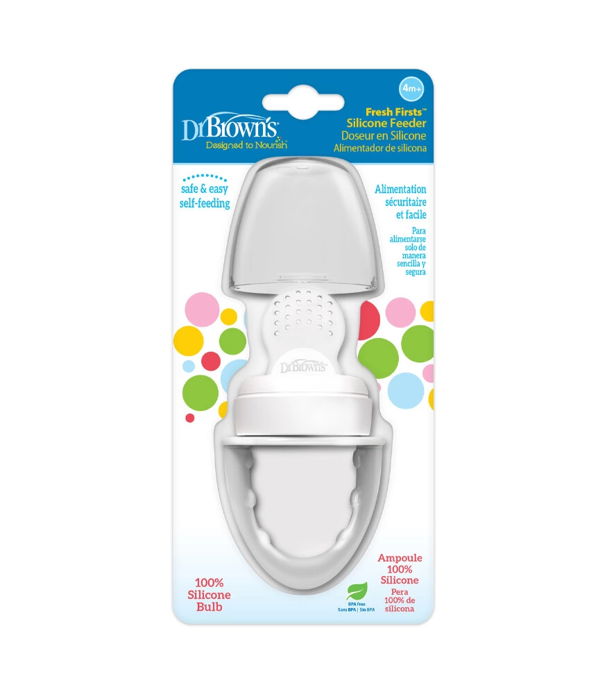 Fresh Firsts Silikon Besleyici, bebeğin güvenli bir şekilde kendi kendine beslenmesine yetecek kadar yiyeceğin geçmesine izin veren küçük deliklere sahiptir.