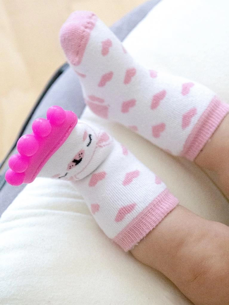 Dönemsel olarak diş etleri kaşınan bebeğinizin ayak parmakları ile oynama refleksine uygun olarak, çorap ucunda bulunan silikon uç bebeğinizin diş etlerini kaşımasına yardımcı olacaktır.