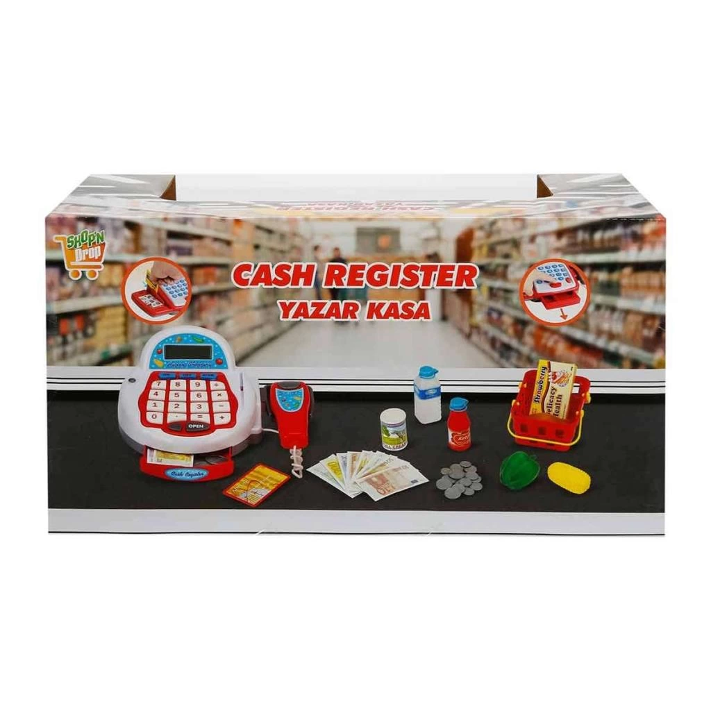 Oyuncak yazar kasada; barkod okuyucu, alışveriş sepeti, çeşitli yiyecekler ve bozuk-kağıt paralar bulunmaktadır.