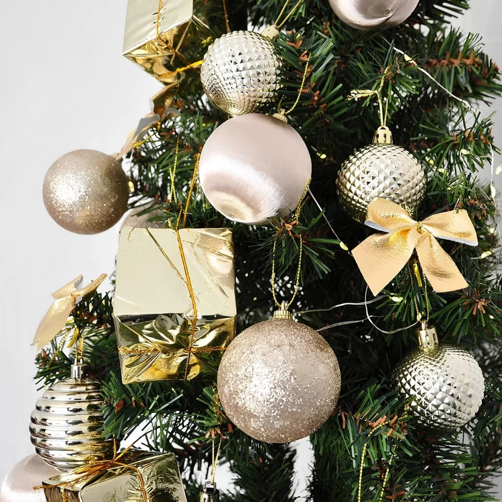 Yılbaşı ağacınızı zarif ve modern bir görünümle süslemek için tasarlanmış Yılbaşı Ağaç Süsleme Seti Şampanya, ışıltılı ve şık bir