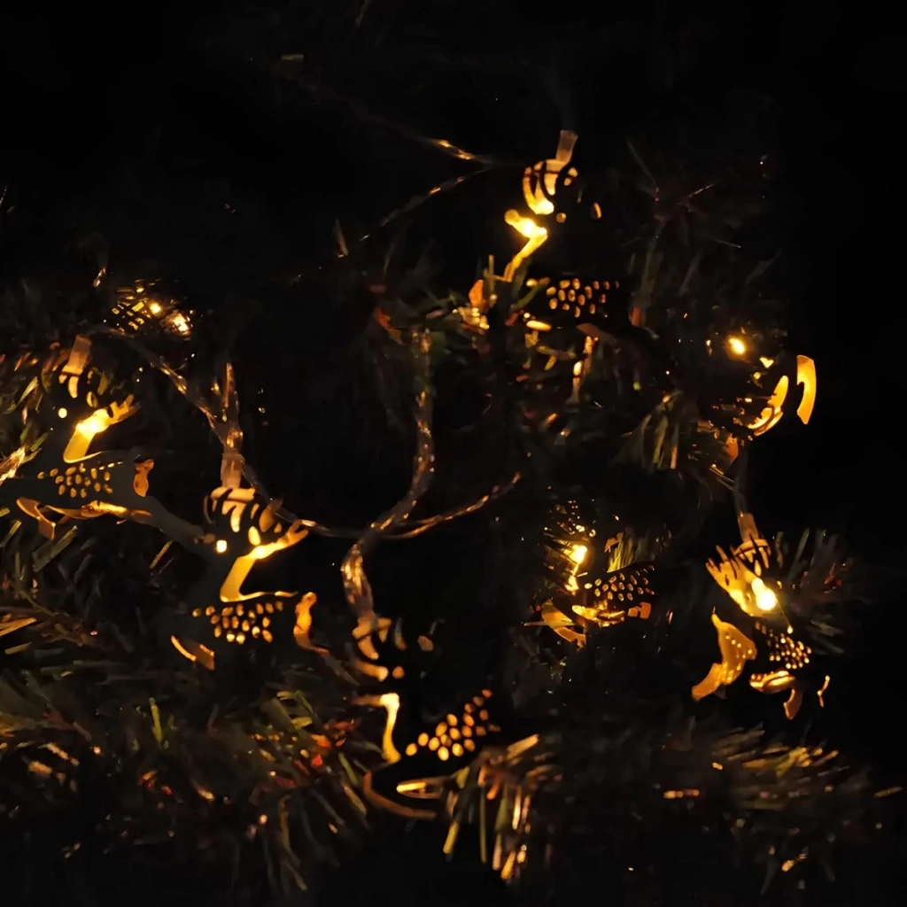 Sıcak ve yumuşak ışığıyla ortama huzur veren bir ambiyans katan bu ışık zinciri, geyik figürleriyle yılbaşı süslemelerine modern ve