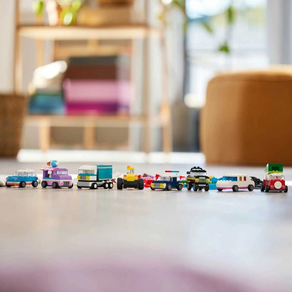 Bir polis arabası, dondurma kamyonu, ATV, ön yükleyici, kamyonet, limuzin, arazi aracı ve station wagon yapın.