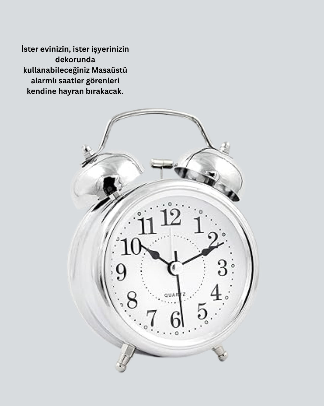 Modern çizgileriyle öne çıkan Yuvarlak Gümüş Işıklı Masa Üstü Saat, hem şık görünümü hem de sessiz çalışmasıyla ideal bir masaüstü tamamlayıcısıdır.Kaliteli metal ve plastik malzemeden üretilmiş dayanıklı gövdesi uzun ömürlü kullanım sağlar. Işıklı kadranı, karanlıkta bile zamanı kolayca görmenizi mümkün kılar. Alarmlı özelliği, uykusu ağır kişileri bile etkili bir şekilde uyandırır.12 cm x 9 cm x 5 cm ölçülerindeki kompakt boyutu, her alanda kullanımı kolaylaştırır. 1 adet AA pil ile çalışır (pil pakete dahil değildir).Dekoratif görünümüyle ev, ofis veya çalışma alanınıza zarif bir atmosfer kazandırır. Ayrıca şık kutu ambalajı sayesinde doğum günü, yılbaşı veya yeni ev hediyesi olarak mükemmel bir tercihtir.