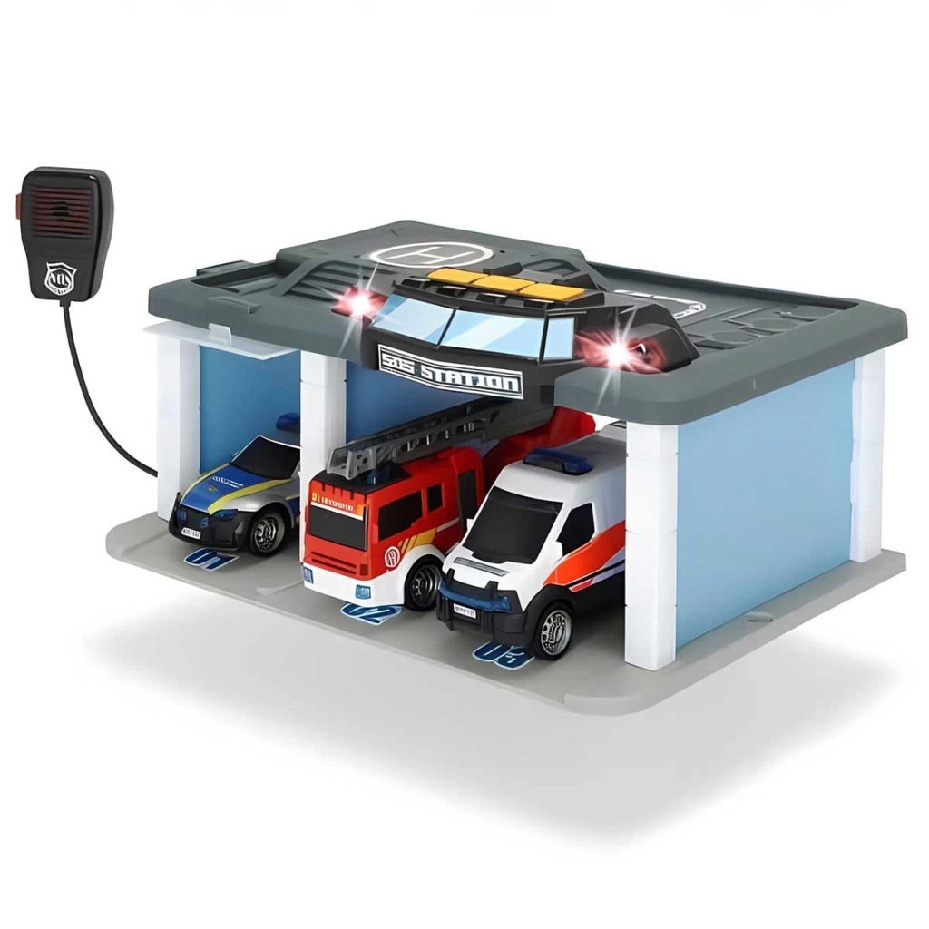 Kurtarma istasyonu üç aracı kolayca barındırır. İtfaiye arabası, polis arabası ve ambulans oyuncak