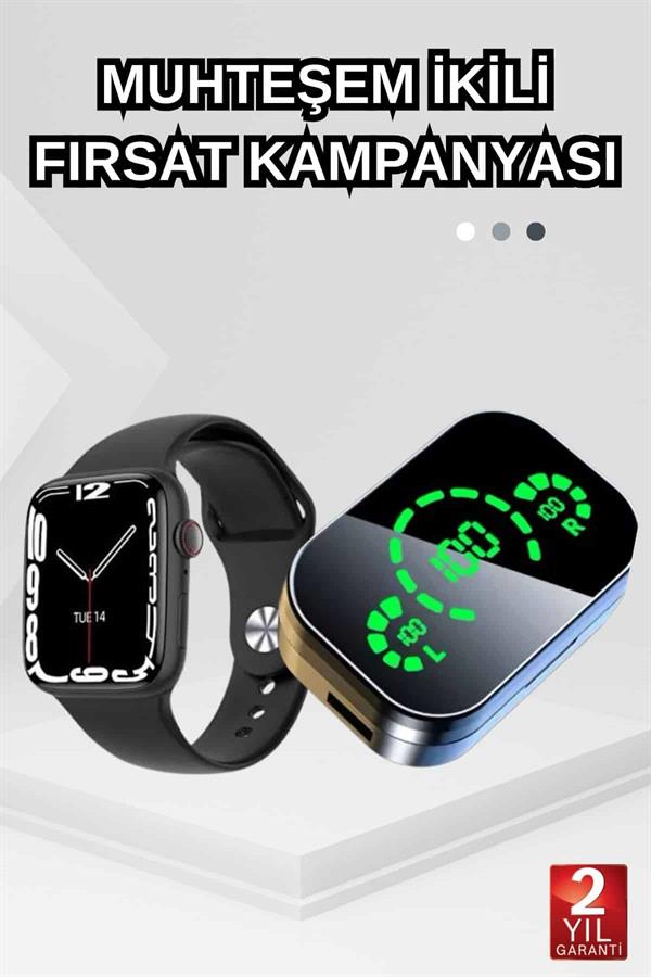 KULAKLIK:Dokunmatik kontrol özelliği sayesinde müziklerinizi ve çağrılarınızı kolayca yönetebilirsiniz. Dahili mikrofonu ile net görüşmeler yaparak, eller serbest deneyiminin keyfini çıkarın. Suya ve tere karşı dayanıklı yapısı sayesinde, spor aktivitelerinizde veya yağmurlu havalarda rahatlıkla kullanabilirsiniz. Çift telefon desteği ile iki cihaz arasında kesintisiz geçiş yaparak, bağlantıda kalın. Aktif gürültü engelleme (ANC) teknolojisi ile dış dünyanın gürültüsünü filtreleyerek, müziğinize tam odaklanabilirsiniz.AKILLI SAAT:Bu akıllı saat, modern teknoloji ile günlük hayatınızı kolaylaştıracak özellikleri bir araya getiren yenilikçi bir cihazdır. Tüm iOS ve Android akıllı telefonlarla uyumlu olan bu saat, geniş bir kullanıcı kitlesine hitap eder. Siri sesli asistan desteği sayesinde sesli komutlarla işlemlerinizi hızlıca gerçekleştirebilirsiniz. Bluetooth bağlantısı aracılığıyla çağrı yapma, çağrılara cevap verme veya reddetme, sık görüşülenler listesini yönetme, çağrı geçmişini görüntüleme ve arayan kimliğini görme gibi birçok özelliği destekler. Ayrıca, SMS ve diğer uygulamalardan gelen bildirimleri görüntüleme ve okuma imkanı sunar.44 mm paslanmaz çelik kasası, dayanıklılığı ve şıklığı bir arada sunar. 240×285 piksel çözünürlükteki, köşeden köşeye tam gelişmiş dokunmatik OLED ekranı, parlak ve net bir görüntü deneyimi sağlar. 280 mAh Li-Po bataryası, uzun süreli kullanım sunarak gün boyu yanınızda olmasını garanti eder. 128 MB bellek kapasitesi ve aktif iki yan tuşuyla kullanıcı dostu bir arayüz sunar.Sağlık ve spor odaklı özellikleriyle öne çıkan bu cihaz, günlük aktivitelerinizi ve sağlık durumunuzu takip etmenize yardımcı olur. Pedometre özelliğiyle egzersiz süresi, kat edilen mesafe ve yakılan kalori gibi verilere ulaşabilirsiniz. EKG, kan basıncı, tansiyon ölçümü ve kandaki oksijen oranını ölçme gibi üçlü sağlık takibi özellikleri sayesinde sağlığınızı yakından izleyebilirsiniz. Uyku takibi, hava durumu, kronometre, alarm, çağrı hatırlatma, hareketsizlik ve su içme hatırlatmaları gibi işlevlerle hayatınızı kolaylaştırır.Spor severler için, koşu, bisiklet, kuvvet antrenmanı, basketbol, tenis, voleybol ve futbol gibi çoklu spor modları sunar. Veri (DATA) sekmesi sayesinde günlük ve anlık sağlık verilerinizi analiz edebilirsiniz. Uygulama üzerinden sınırsız saat kadranı seçebilir ve ekranınıza dilediğiniz fotoğrafı yerleştirebilirsiniz. Akıllı bileklik hareket sensörü, ekranın kolayca açılıp kapanmasını sağlar.10 kişiye kadar hızlı arama özelliği, değiştirilebilir kordon seçeneği ve Türkçe dahil 23 farklı dil desteğiyle kişiselleştirilebilir bir deneyim sunar. Uçak modu ve rahatsız etme modu gibi işlevlerle kullanımınızı daha verimli hale getirebilirsiniz. Saat üzerinden müzik dinleme, uzaktan fotoğraf çekme gibi eğlenceli özellikler de cihazın dikkat çeken detayları arasındadır.Şıklığı, dayanıklılığı ve fonksiyonelliği bir araya getiren bu akıllı saat, hem teknoloji tutkunları hem de aktif bir yaşam tarzını benimseyen kullanıcılar için mükemmel bir tercihtir.