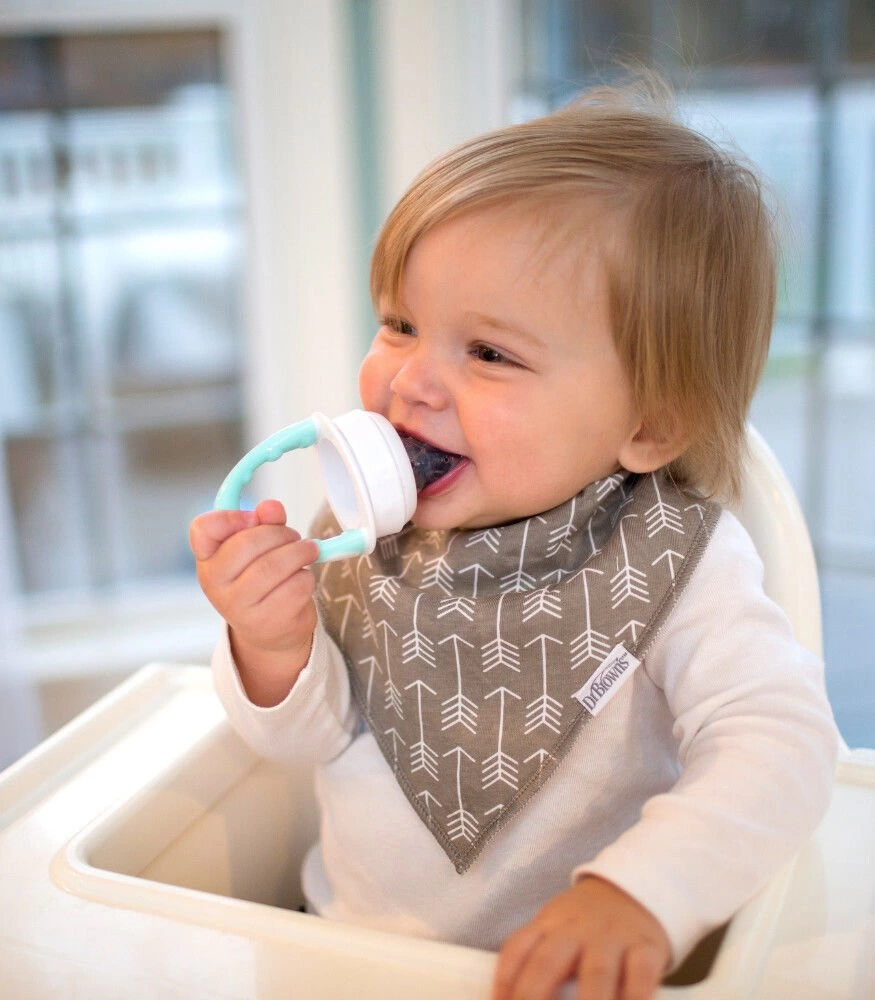 Fresh Firsts Silikon Besleyici, bebeğin güvenli bir şekilde kendi kendine beslenmesine yetecek kadar yiyeceğin geçmesine izin veren küçük deliklere sahiptir.
