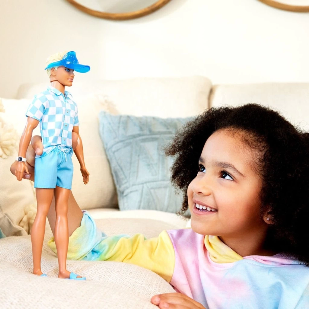 –Ken® bebeğin üzerinde mavi ve beyaz renkli karo desenli bir gömlek ve uyumlu, açık mavi bir deniz şortu vardır. Parlak mavi terliklerinde Ken® logosu bulunur.