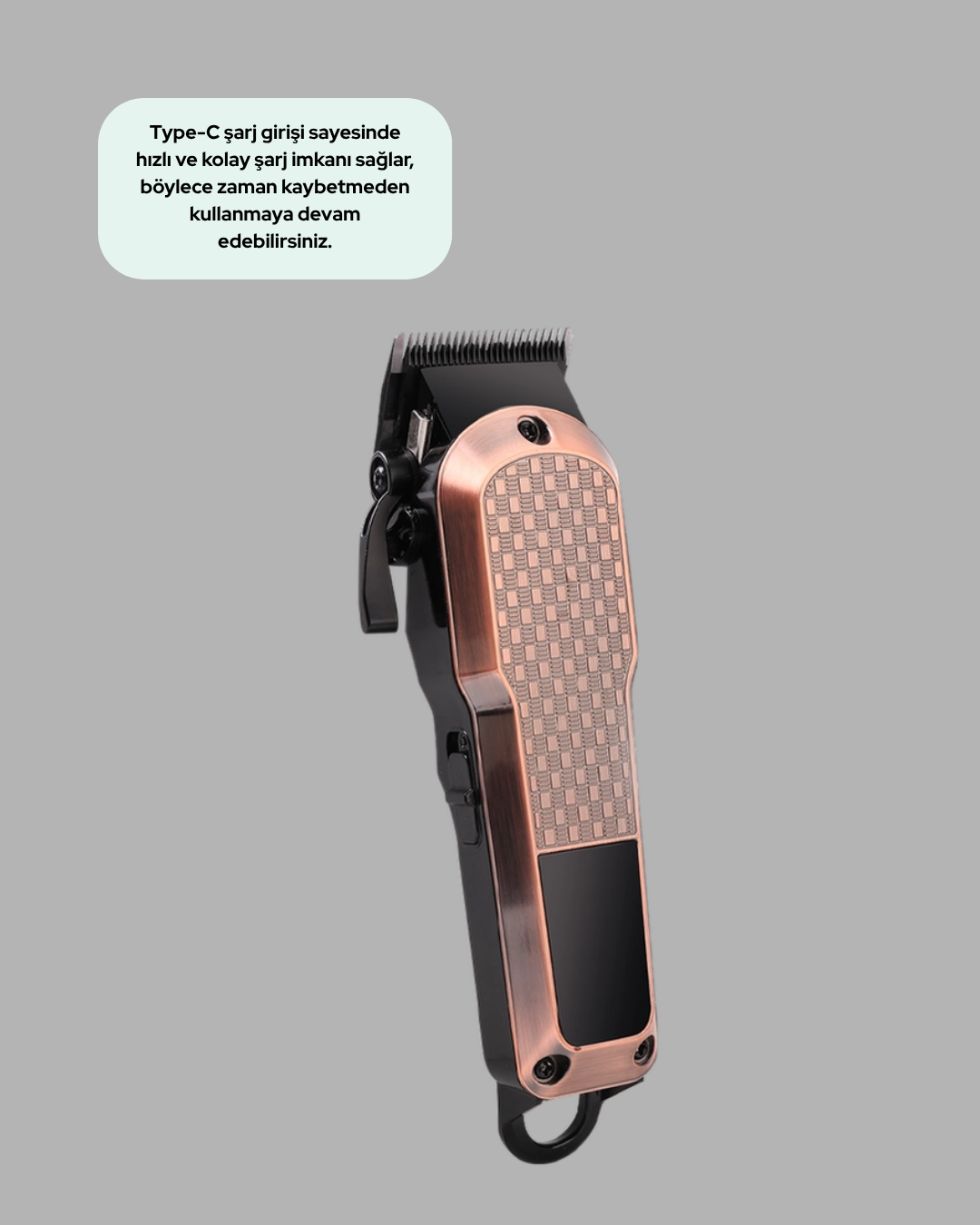 Güç, estetik ve pratikliği bir araya getiren bu erkek bakım makinesi, profesyonel tıraş deneyimini evinize taşıyor. 7000RPM yüksek performanslı motoru, saç ve sakal kesiminde üstün sonuçlar sunar.LCD ekranı, şarj seviyesini ve kesim modlarını kolayca takip etmenizi sağlar. Type-C hızlı şarj özelliği, kablo karmaşasını ortadan kaldırır ve her ortamda kolay kullanım imkânı tanır. 4 farklı kesim ayarı, kişisel tarzınızı oluşturmanızı sağlar.Suya gerek duymadan kuru kullanım özelliğiyle her yerde pratik tıraş olabilirsiniz. F tipi priz yapısı, uluslararası standartlara uyum sağlar ve seyahatlerde rahat taşınabilir. Saç, sakal, ense ve vücut bölgelerinde yüksek hassasiyet sunar. Burun ve kulak temizleme başlığı, detaylı bakım için ekstra konfor sağlar.3 saate kadar kesintisiz şarjlı kullanım, uzun günlerde bile performansın düşmemesini garanti eder. Siyah metalik gövdesi, modern ve şık görünümüyle her yaşa hitap eder. Sessiz motoru ve ergonomik tutuşu sayesinde rahat bir kullanım sunar. Güvenilir yapısı, uzun ömürlü kullanım için idealdir.