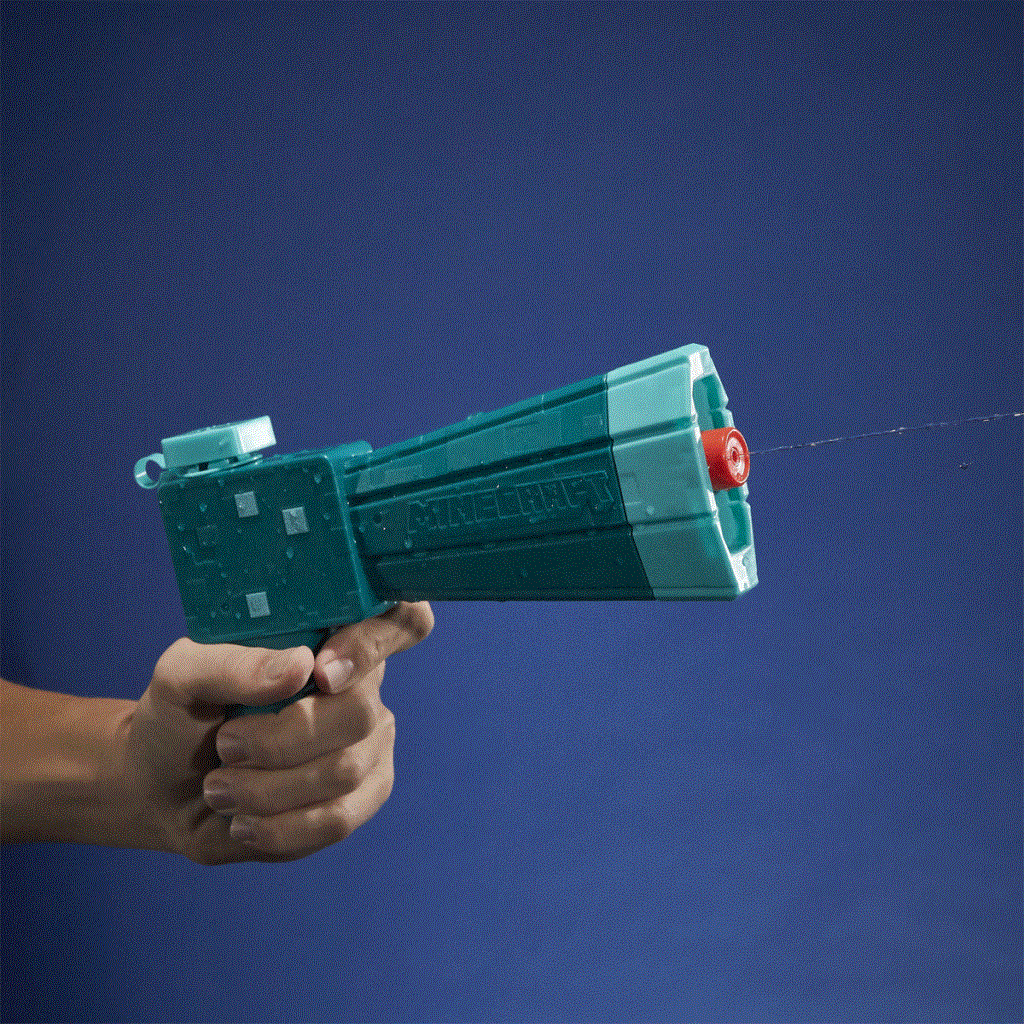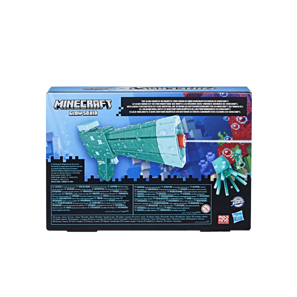 Çocuk Super Soaker Minecraft Parlayan Mürekkep Balığı su tabancası Minecraft’taki mürekkep balığı su yaratığından esinlenilen bir tasarıma sahip.