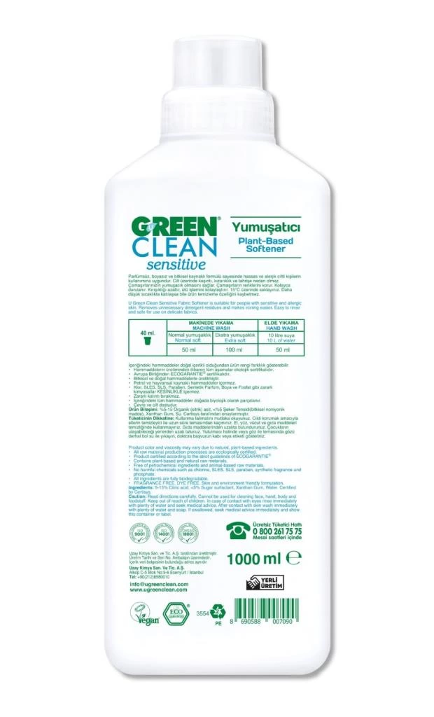 U Green Clean Sensitive Bitkisel Çamaşır Yumuşatıcı, çamaşırlarınızın yumuşacık olmasını sağlar.