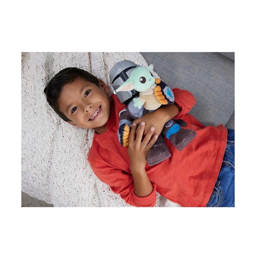 11 inç boyunda Mandalorian peluş, yumuşak bir peluş gövde üzerinde oyulmuş bir kafaya sahipken, daha küçük Grogu peluş, daha fazla oyun ve sarılma fırsatı için kollarında güvenle durur veya ayrılır.
