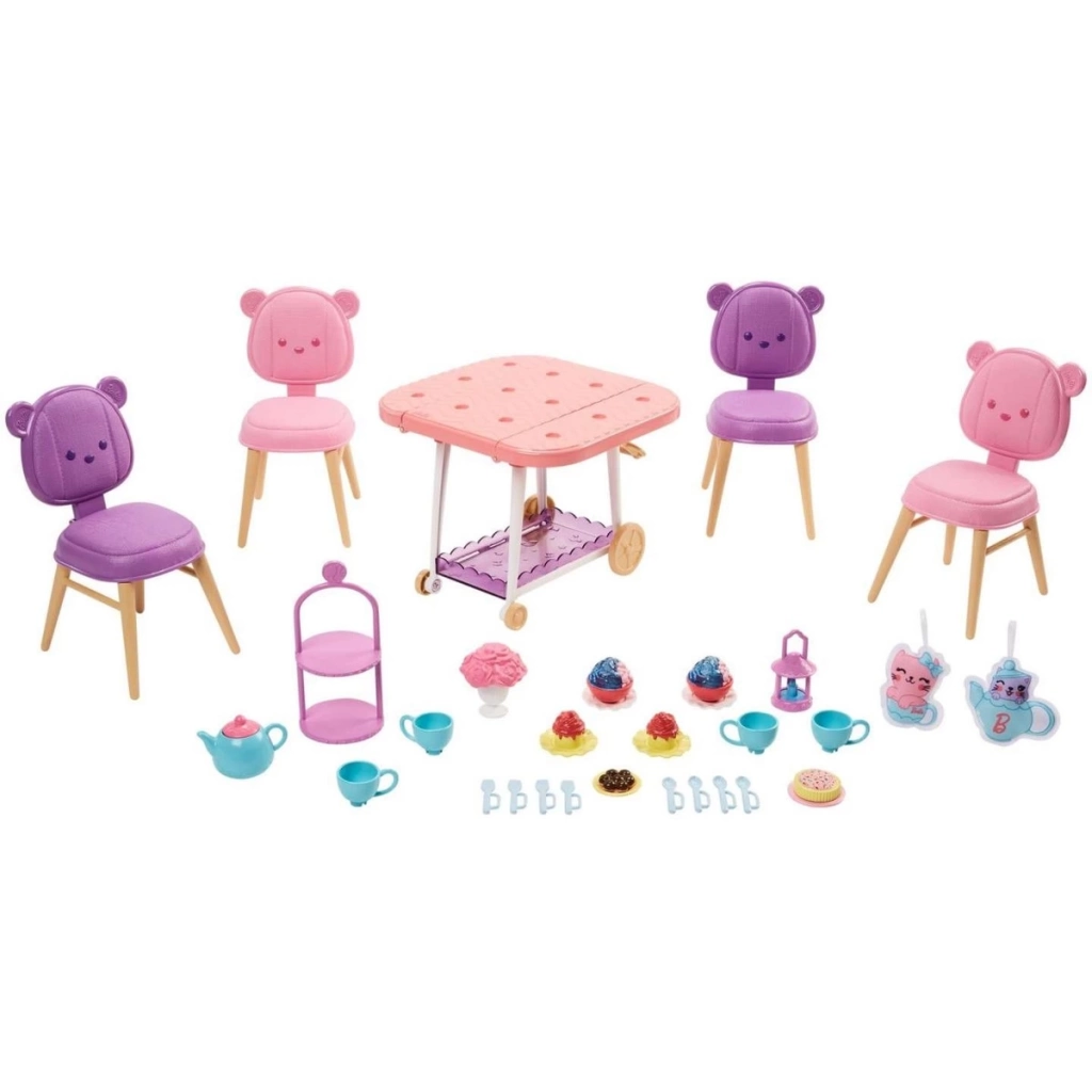 Çay partisi oyun seti, açılınca dört My First bebeğin oturabileceği sandalyeli masaya dönüşen bir büfe içerir. Sette