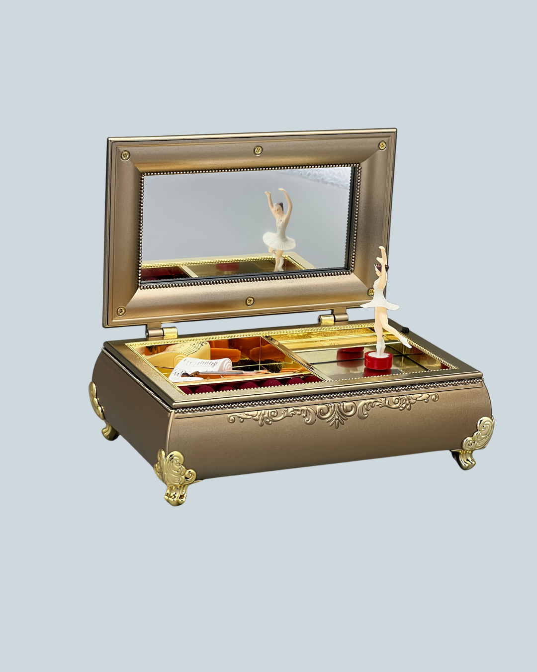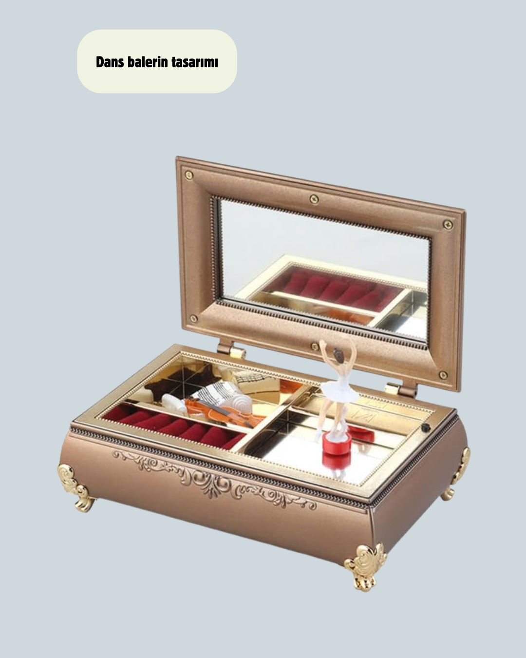 Balerinli müzikli takı kutusu, zarif ve ince detaylarla tasarlanmış dekoratif bir kutu arayan kullanıcılar için harika bir tercihtir. Piyano görünümü ve fırın boya kaplaması sayesinde uzun yıllar boyunca kalitesini koruyan dayanıklı bir yapıya sahiptir. Ürün, nostaljik ve modern çizgileri bir araya getirerek hem çocuk odaları hem yetişkin yaşam alanları için ideal bir dekoratif obje sunar.Kutu açıldığında karşınıza çıkan balerin figürü, müzik eşliğinde sergilediği görüntüyle oldukça etkileyicidir. Melodi, ürüne romantik bir hava katar ve izleyen kişiye sakinlik verir. Bu görüntü, özellikle çocukların ilgisini çekerek ürünü hem eğlenceli hem masalsı bir aksesuar haline getirir.Kutu içinde yer alan bölmeler, takıların düzenli bir şekilde saklanmasını sağlar. Bu bölmeler; yüzük, kolye, küpe, bileklik gibi ufak aksesuarların kaybolmasını engeller ve her şeyin düzenli şekilde bir arada durmasını mümkün kılar.Hediye olarak verilmek istendiğinde her yaşa hitap edebilen çok yönlü bir tercihtir. Bale, müzik veya klasik dekor ürünlerine ilgi duyan herkes için anlamlı bir armağan niteliği taşır. Kız çocukları için özel günlerde kalıcı bir anı bırakır, yetişkin kullanıcılar için ise nostaljik bir süs eşyası olur.Piyano formundaki detaylı tasarım, ürünü vitrinlerde, makyaj masalarında ve çalışma alanlarında göz alıcı bir dekoratif obje haline getirir. Kutu içindeki küçük takı bölmeleri ise kullanıcıya hem estetik hem işlevsel bir çözüm sunar.Balerinli müzikli takı kutusu; romantik atmosferi, kaliteli yüzey yapısı, müzik detayları ve çok yönlü saklama alanı ile yaşam alanlarına zarafet katmak isteyen herkes için harika bir seçimdir.