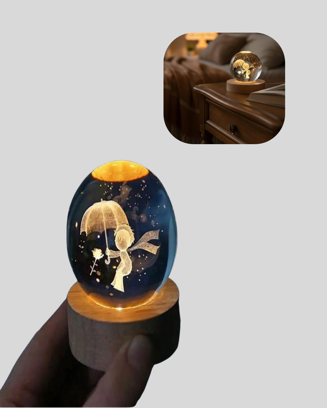 Bu Küçük Prens LED Kristal Top Lamba, ev ve ofis dekorasyonuna modern, minimal ve duygusal bir dokunuş ekler. Kristalin içindeki 3D motif, gece ışığı açıldığında etkileyici bir parlama oluşturur ve bulunduğu mekana sıcak bir enerji getirir. 8 cm kristal top ve 7,5 cm ahşap altlık, masa, komodin, raf ve ofis alanlarında şık bir görüntü sağlar.3000K sıcak ışık, ortama yumuşak bir parlaklık katar ve göz yormaz. Bu nedenle hem dekoratif obje hem de fonksiyonel gece lambası olarak kullanılabilir. Küçük Prens figürü, özellikle kitap severlerin, romantik tasarımları sevenlerin ve koleksiyon meraklılarının beğenisini kazanır.